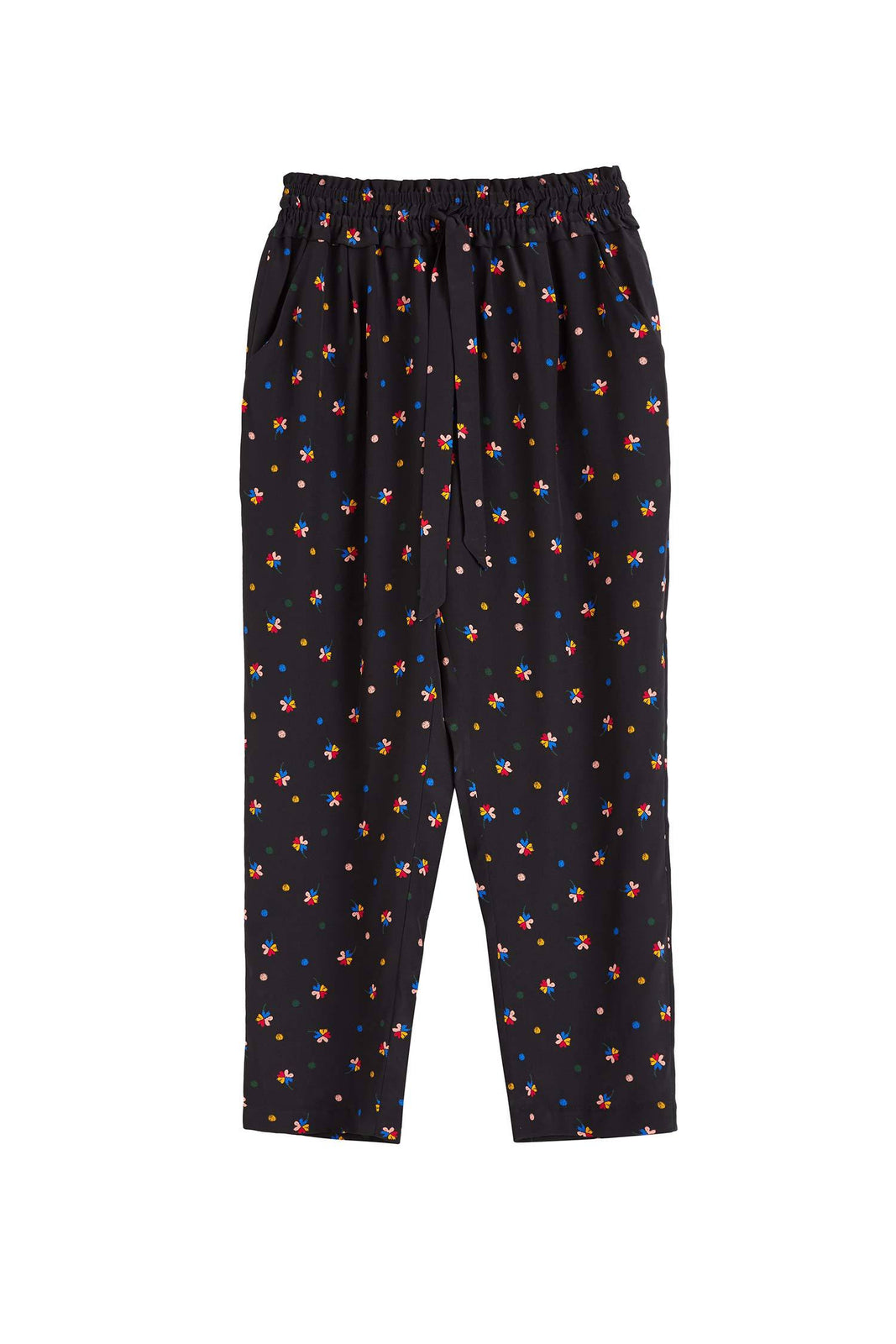 In a tapered leg, our black Lucky Clover silk trousers scream casual sophistication. Tailored in a slim fit, these 3/4 length trousers are inherently quite smart-looking but are dressed-down with their drawstring waist and hip pockets for ease of wear. In other words, the perfect pair of pants.