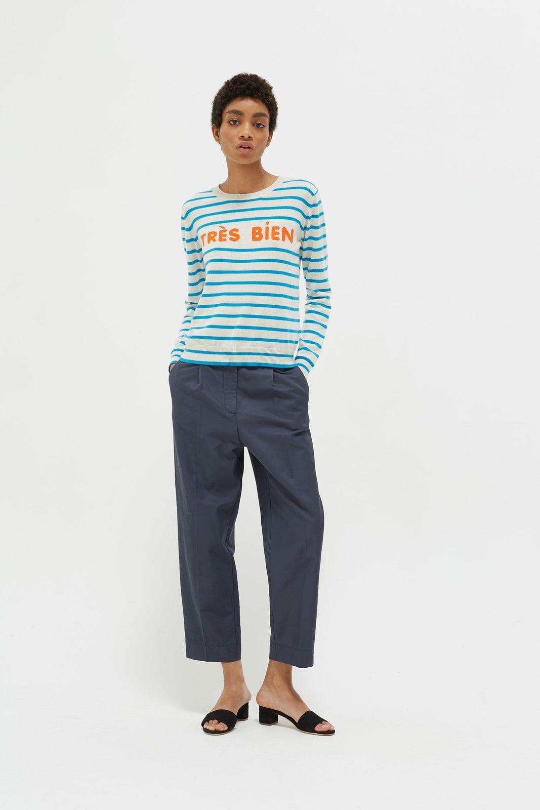 A playful new interpretation of the iconic Breton knit, this cream and turquoise striped sweater features one of the new slogans for Pre-Fall 2019, spelling out the French phrase Très Bien in orange intarsia. Made from 14-gauge pure cashmere, it is shaped for quite a small fit with a round neck and ribbed trims.