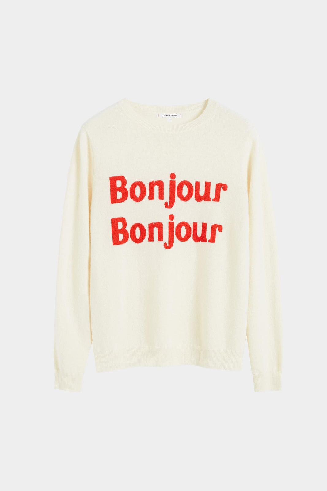 Say hello to your new favourite sweater. Made from a soft blend of cashmere and wool, this cream knit features the word Bonjour spelled out across the chest in bright red intarsia. Wear with a printed skirt or cropped trousers for a chic, playful nod to Parisian style.