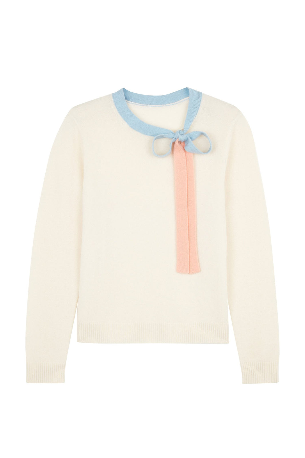 This cream cashmere and wool-blend sweater is shaped for a regular fit with ribbed trims at the cuffs and straight hem. A contrasting colour-blocked neck tie fastens in a bow at the crew neck.