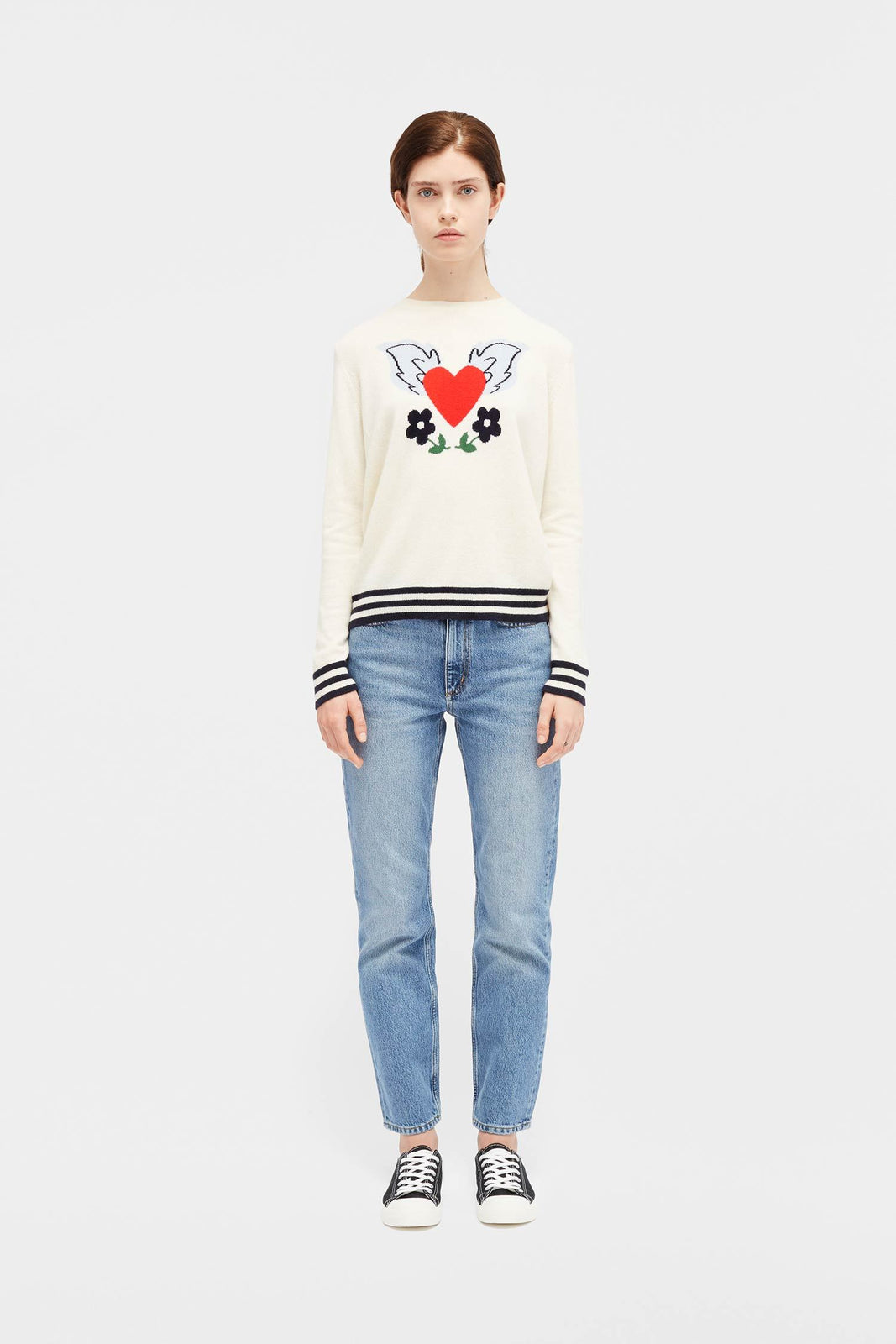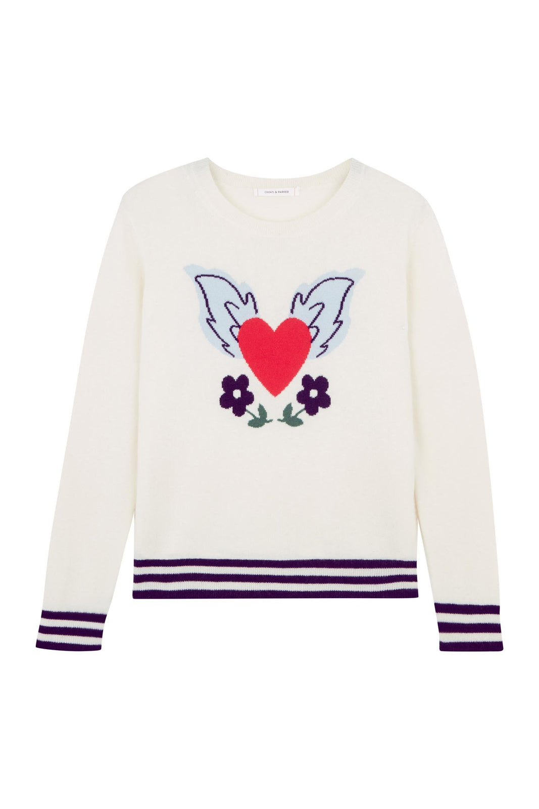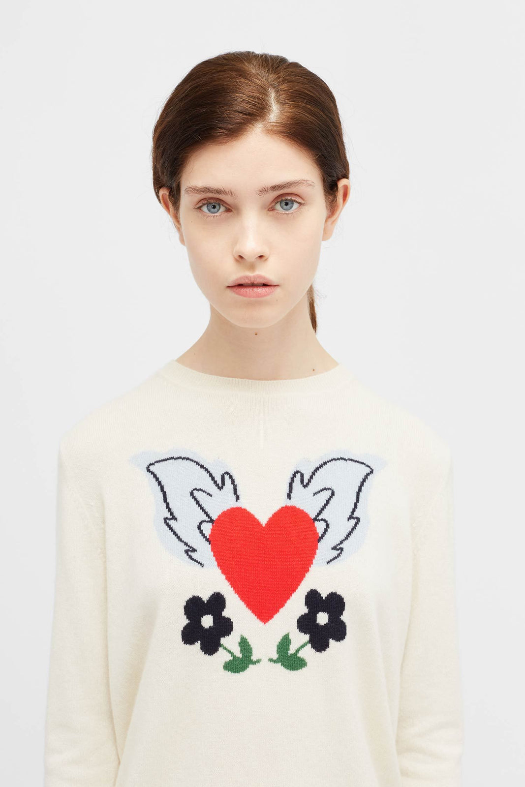 This cream 100% cashmere sweater is emblazoned with a true-intarsia Juliet Heart motif. It's crafted to a classic weight and fit, and simply finished with ribbed trims.