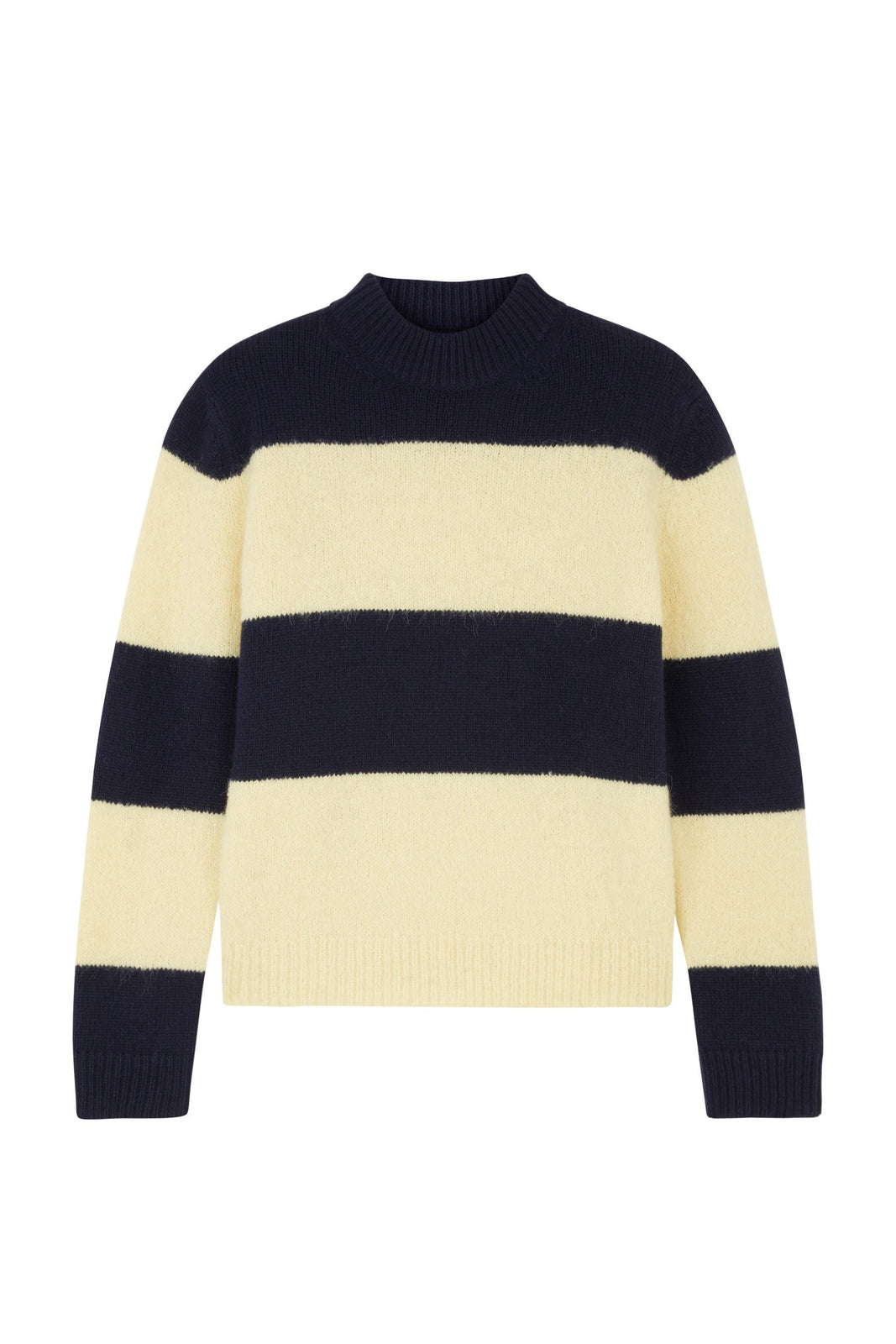 In sunshine-navy and yellow stripes, this sweater is crafted from a cosy blend of alpaca and wool. It's shaped for a slouchy fit with a slight turtle neck and ribbed trims.