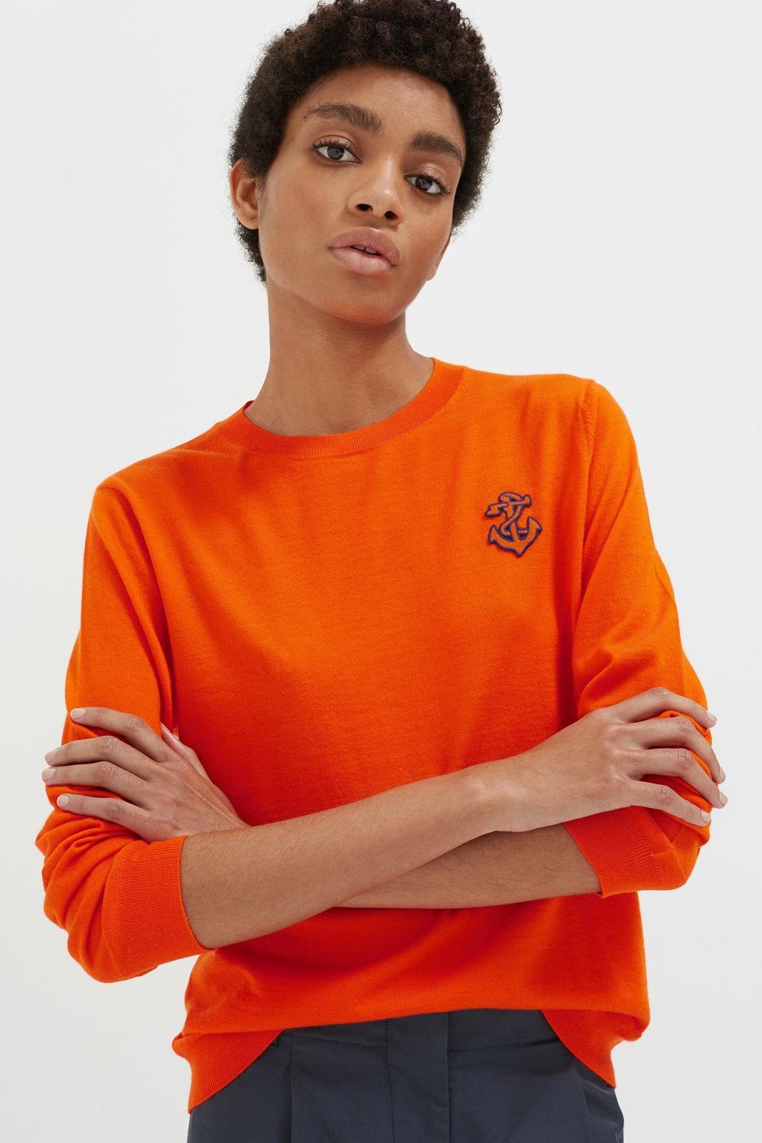 A new-season take on a wardrobe essential, this versatile orange sweater is defined by a delicate embroidered anchor badge on the chest. A ladylike, subtle nod to the nautical theme, it is made from pure, lightweight 16-gauge cashmere with subtle stitch detailing on the sleeves and bottom hem.