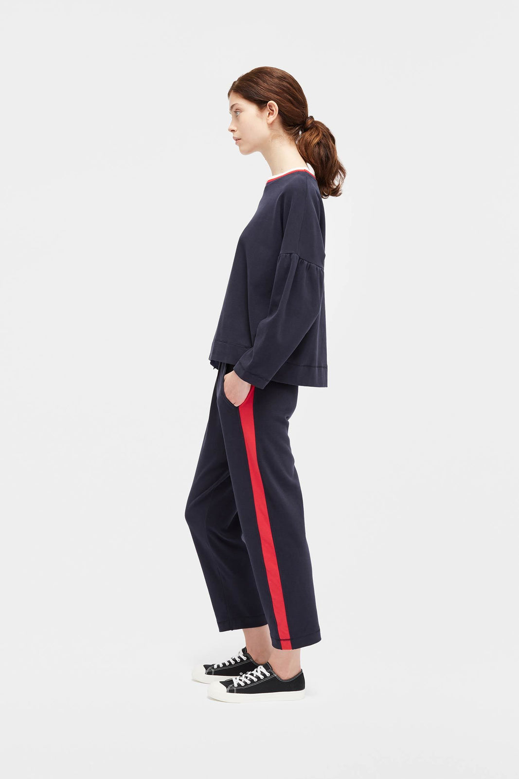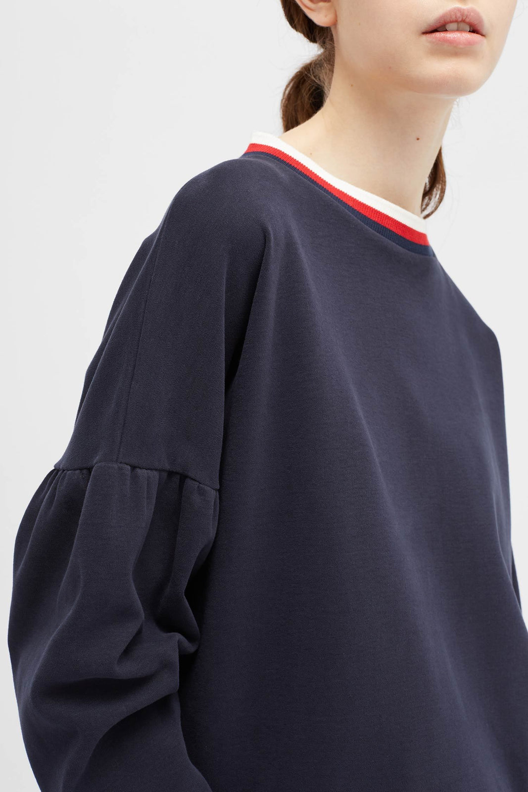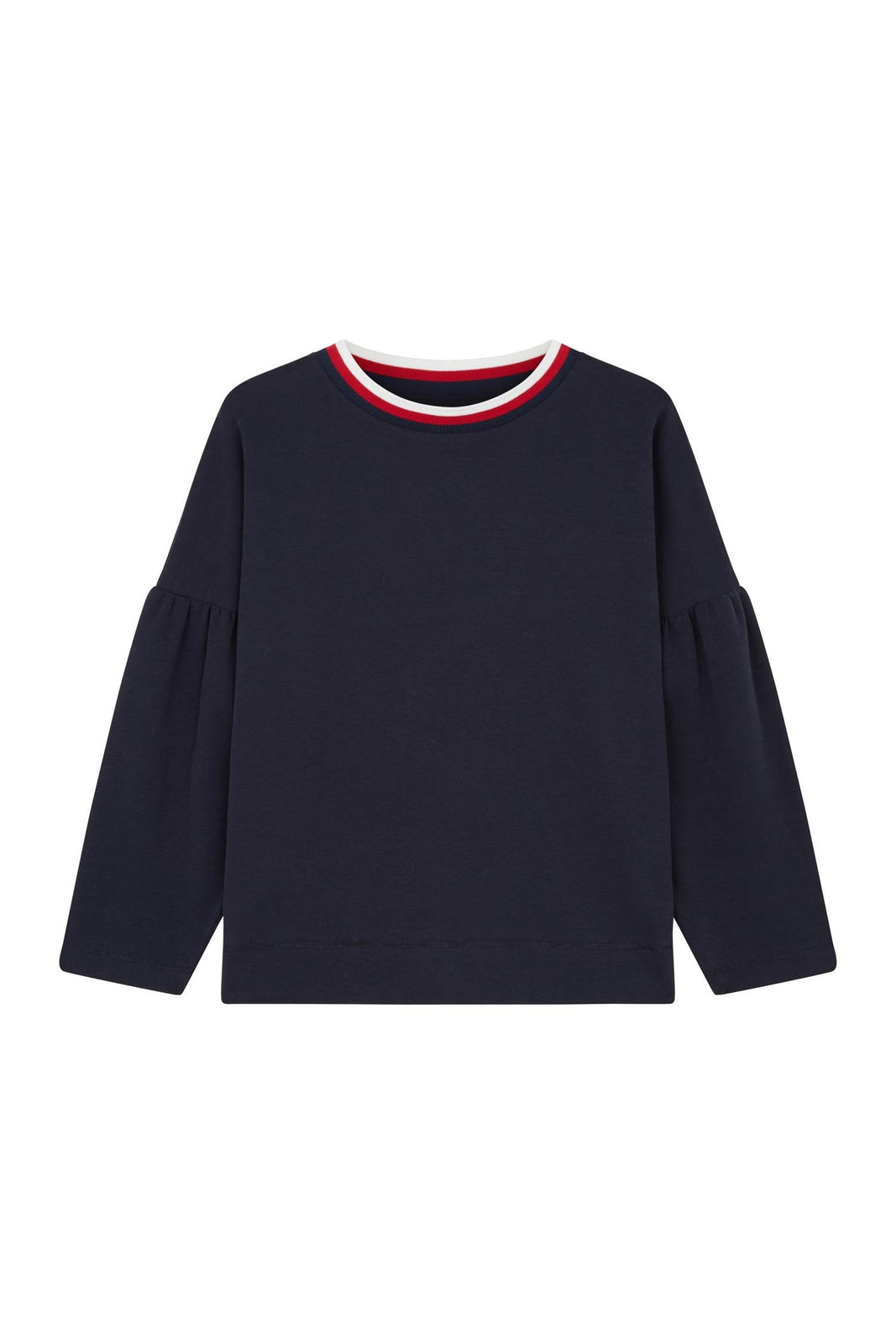 This navy 100% cotton top is crafted with dropped shoulders and tulip sleeves for a statement silhouette. The neckline is edged with red and white ribbed-knit stripes, while the straight hem is finished with baseball stitching.