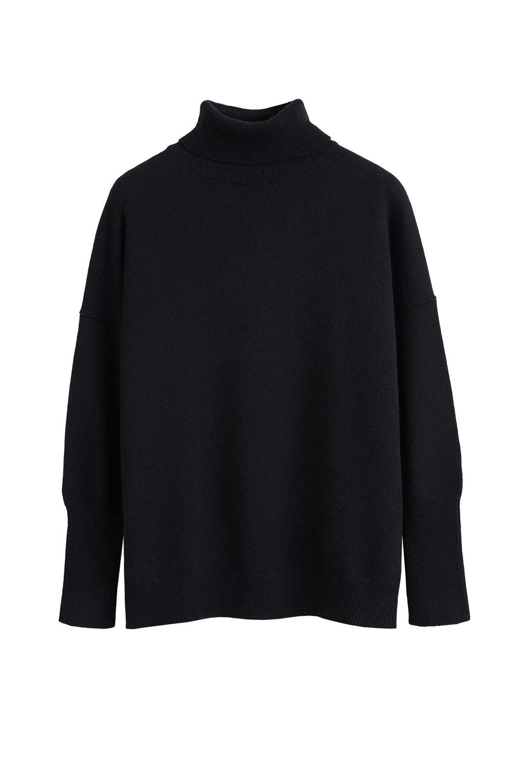 This black, 100% cashmere sweater is a must for winter. With a luxurious roll neck and deep rib cuffs, it's guaranteed to keep you warm during cooler months.