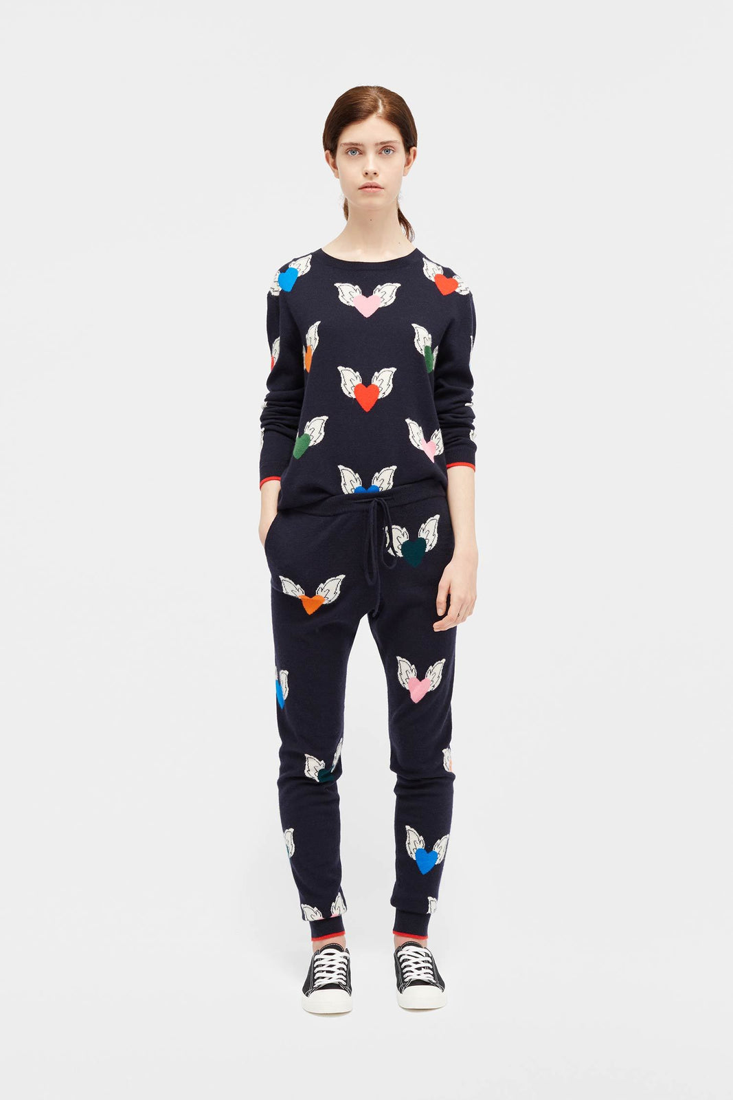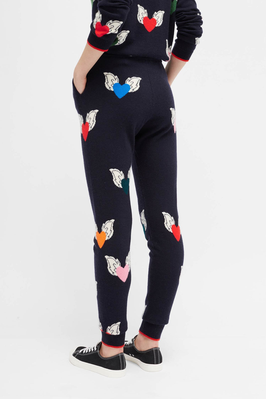 Our navy 100% cashmere track pants are updated this season with a Juliet Heart intarsia pattern. They're crafted for a slim fit with a drawstring waist, pockets, and red tipping at the cuffs.