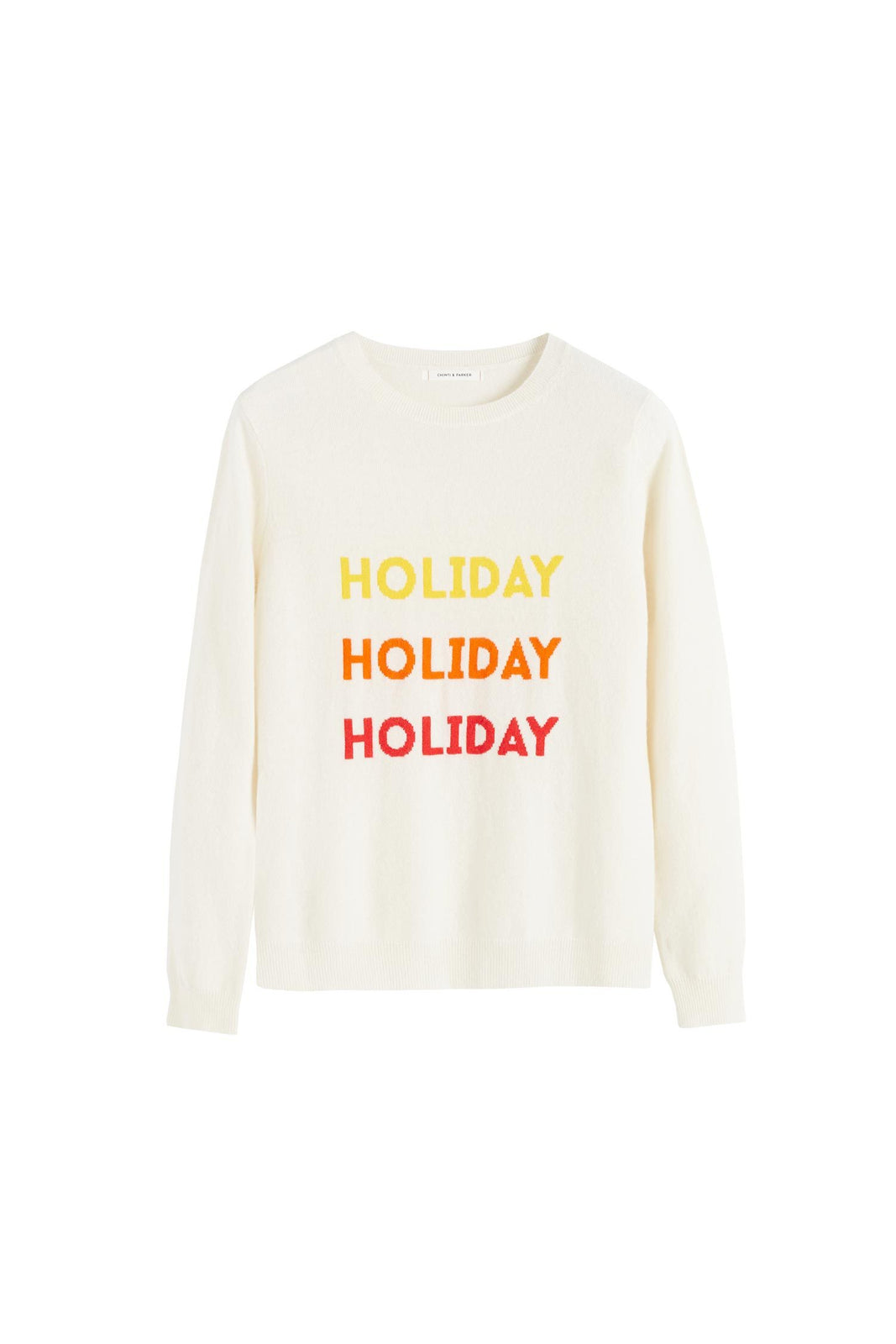 Whether you’re jetting off somewhere exotic or simply reminiscing of sun-soaked getaways, this playful sweater is the perfect piece for the summer months. Made from cream wool with a touch of cashmere for softness, it features striking intarsia across the front spelling out Holiday three times in graduating sunset shades of yellow, orange and red.