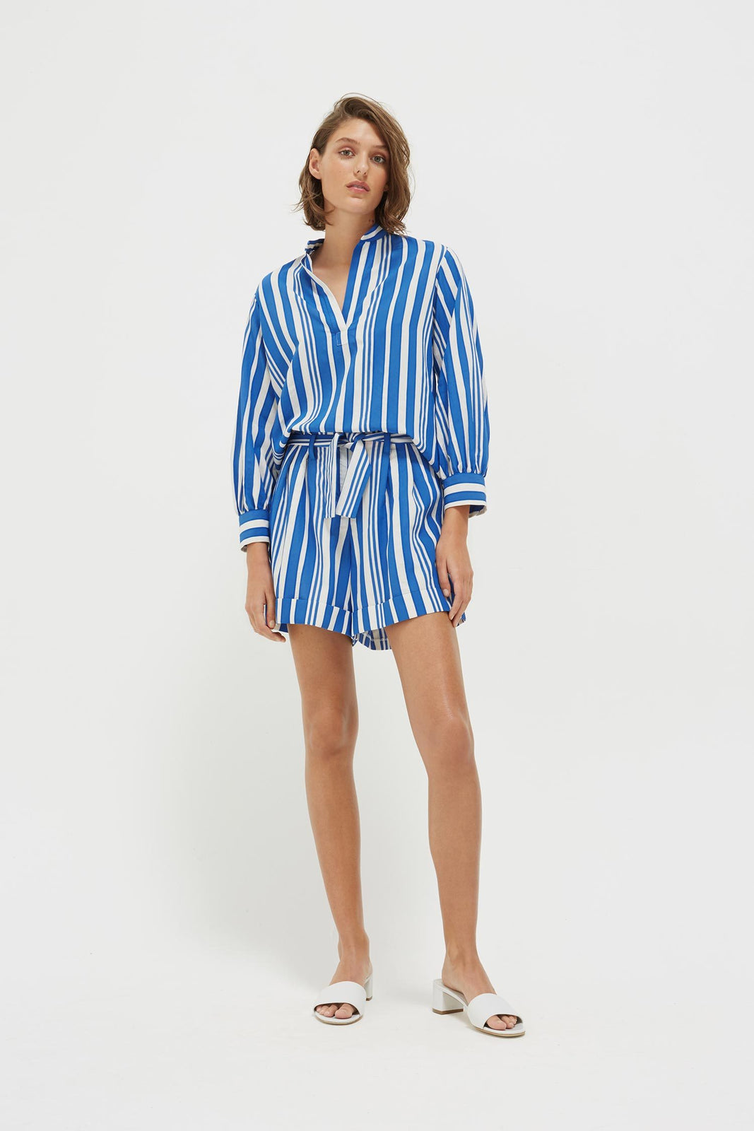 No summer wardrobe is complete without a great pair of shorts. In line with this season’s nautical theme, these tailored ones are made from a lightweight viscose jacquard, interwoven with blue and ivory parasol stripes. They are designed to sit comfortably on the waist, with a coordinating tie belt to adjust the fit. Tuck in the coordinating blouse for an effortlessly elegant look for sun-kissed days.
