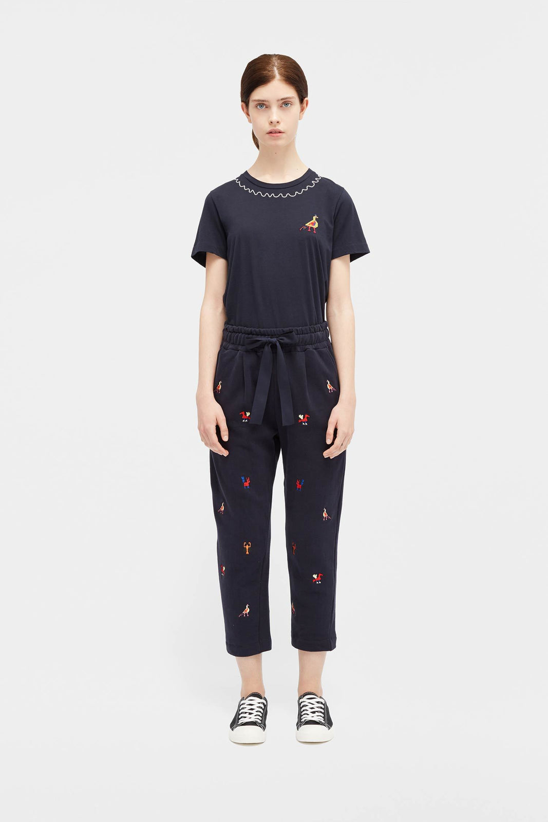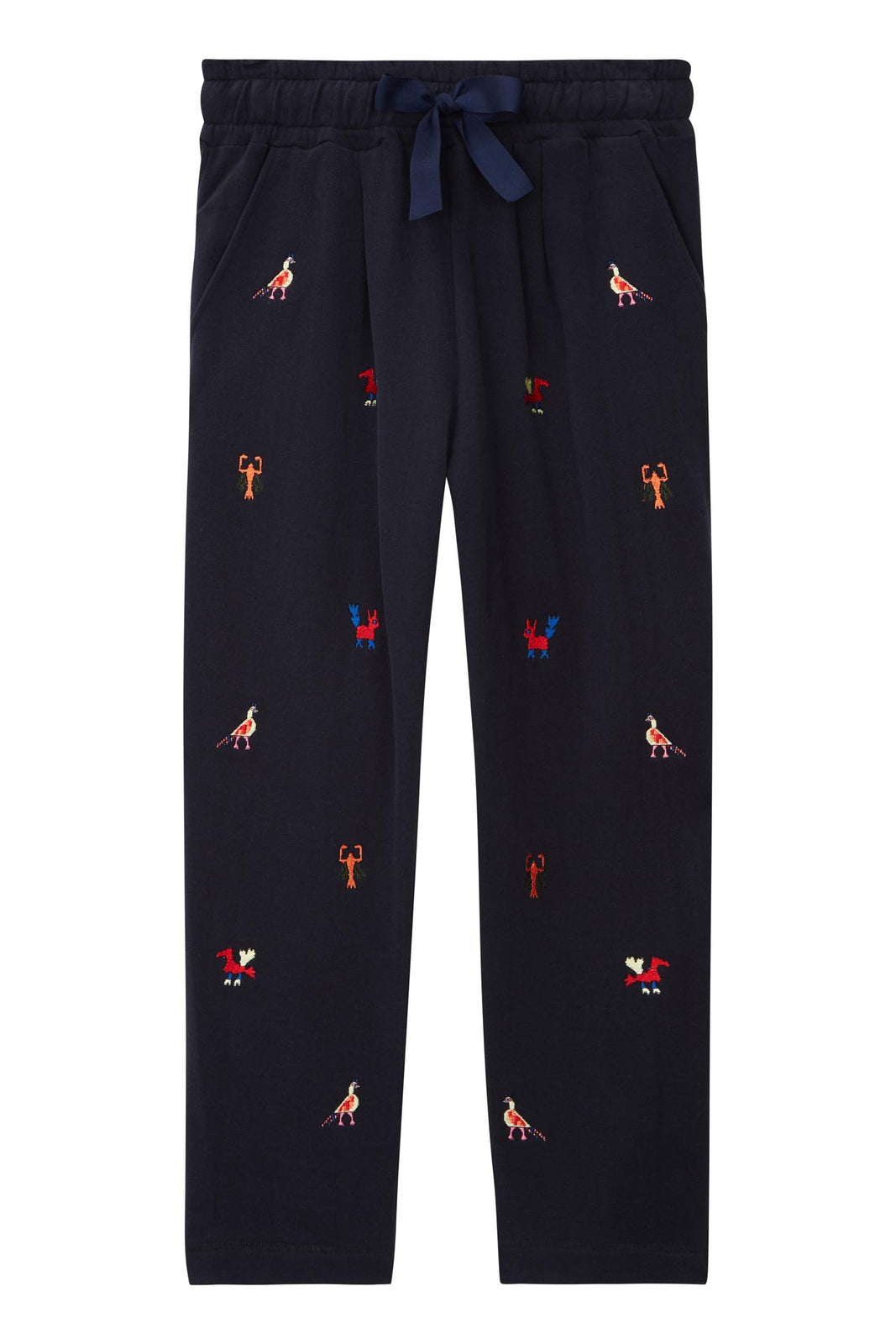 These navy 100% cotton track pants feature our vibrant Mexican-inspired Aztec animal motif. The silhouette is slim with an elasticated drawstring waist, side pockets, and slightly cropped legs with baseball-stitched hems.