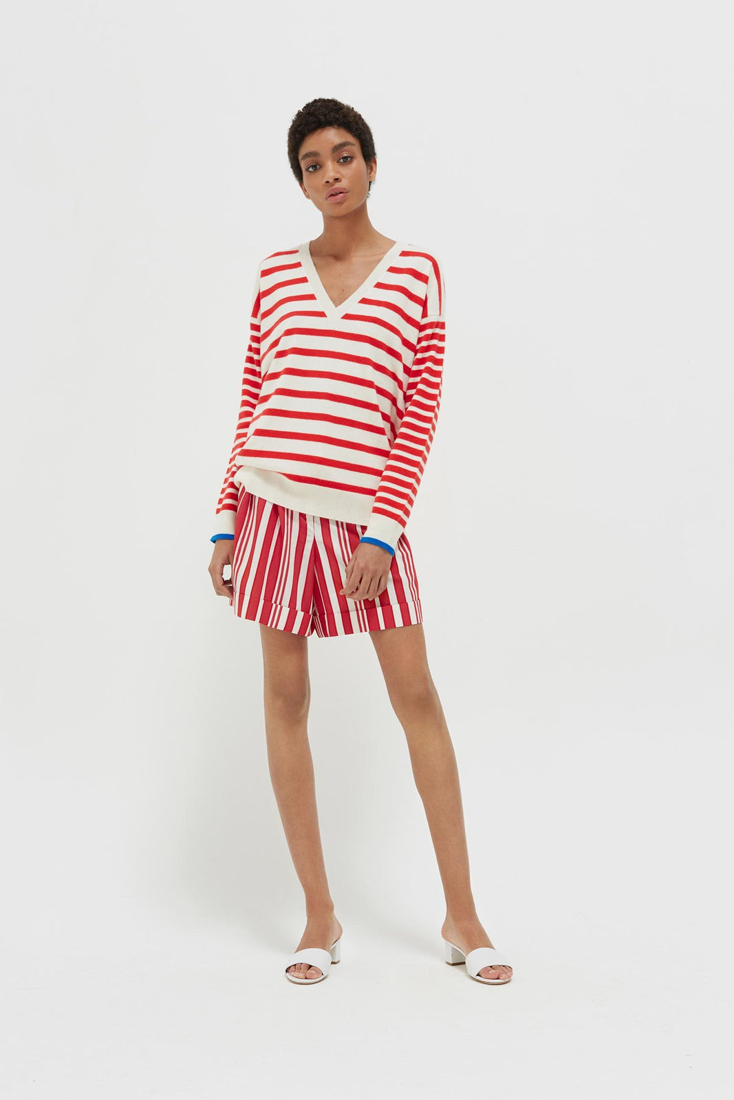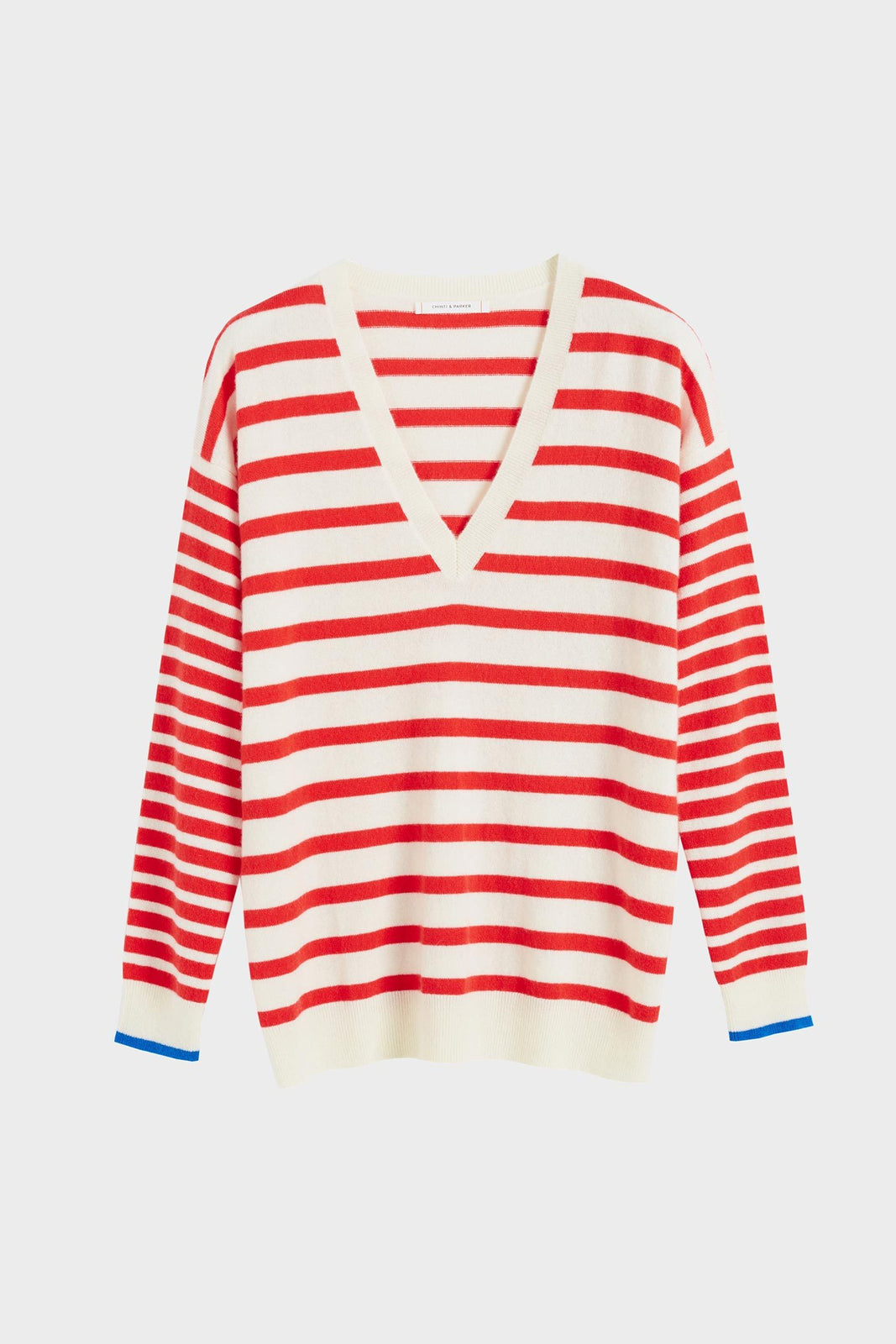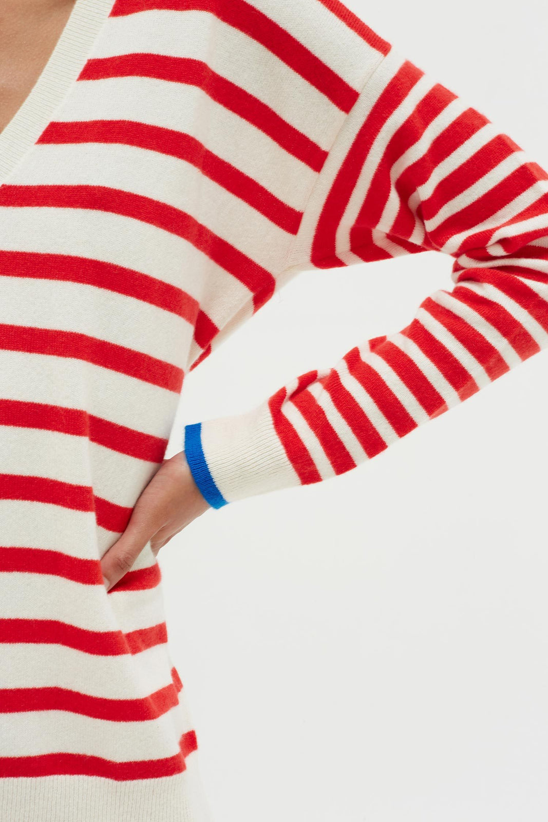The Red Striped Cashmere V Neck Sweater is a slouchy.
