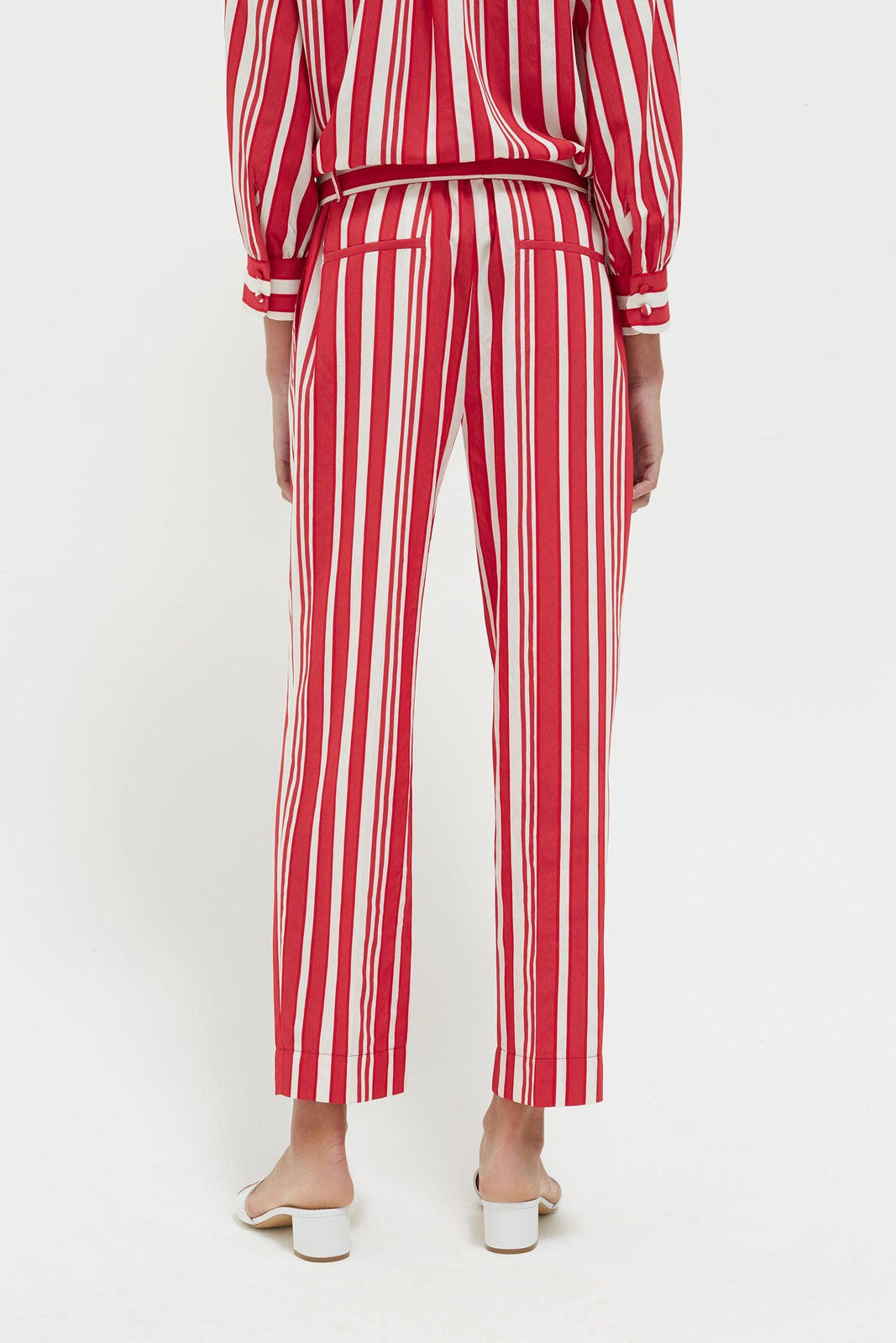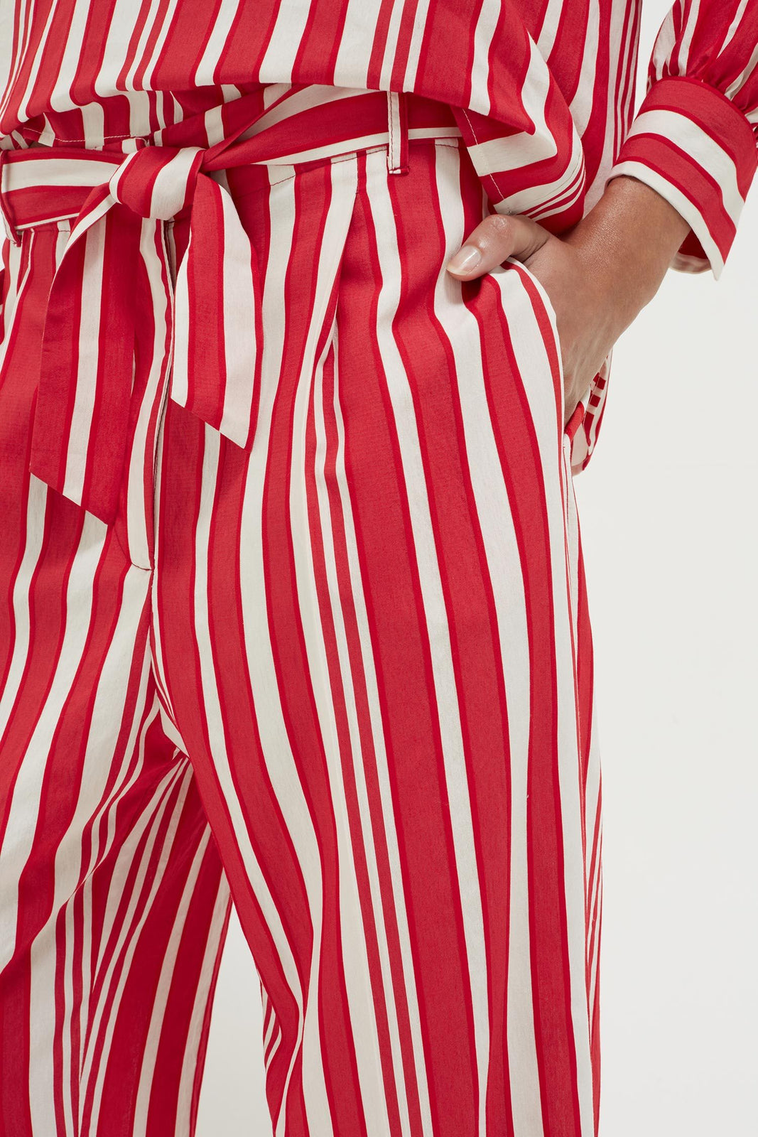 Every wardrobe needs a great pair of relaxed tailored trousers. These ankle-length, straight-leg ones are crafted from a lightweight viscose jacquard interwoven with a red and ivory parasol stripe, making them ideal for the warmer months. Team with the coordinating blouse or sleeveless top for a playful summer look.