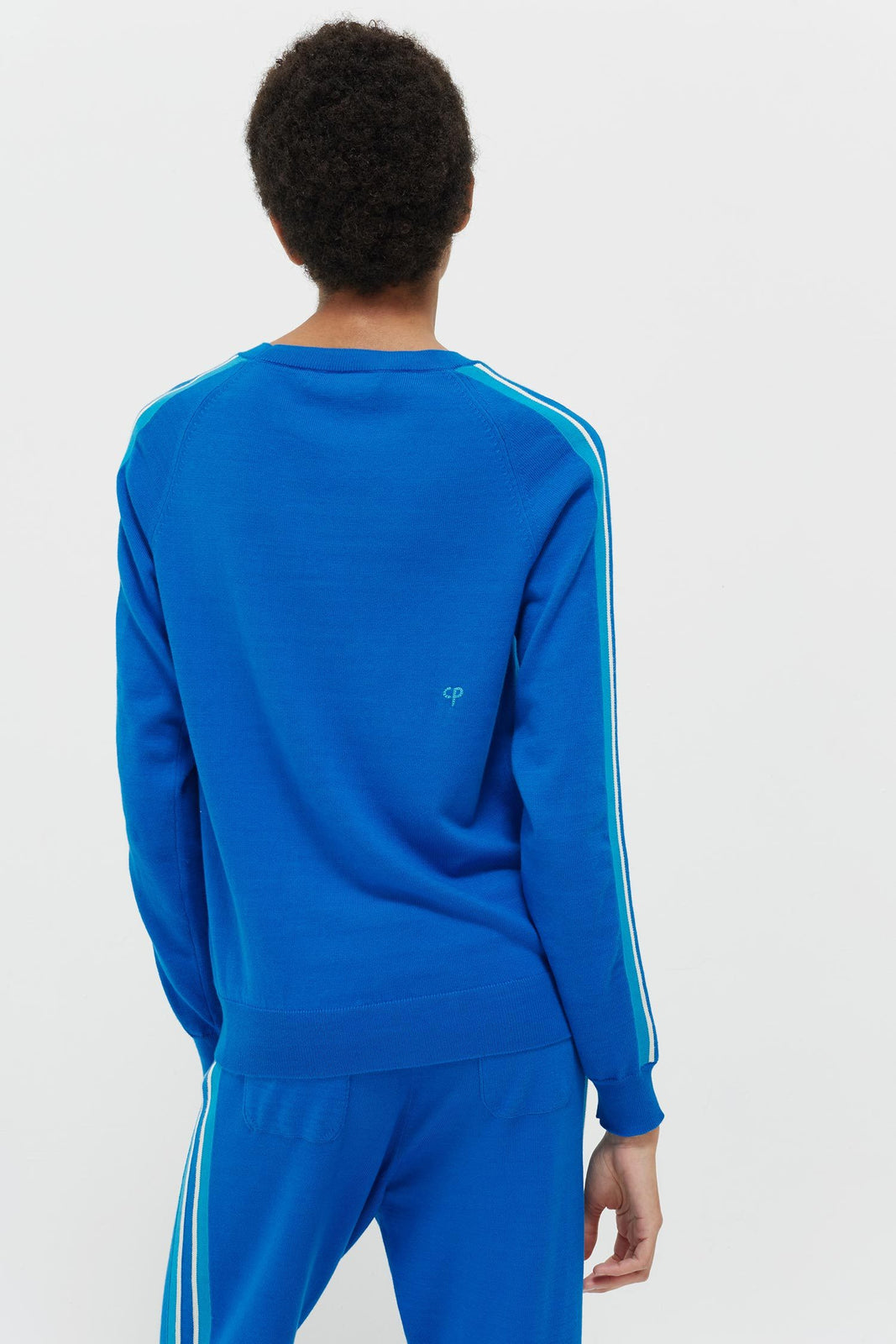 This season focuses on relaxed co-ords that you can easily mix and match with other pieces in your wardrobe. Perfect for relaxing at the weekend or travelling in, this royal blue sweater is reminiscent of traditional sportswear, featuring contrasting turquoise and cream stripes along the sleeves. Complete the chilled-out look with the matching trackpants and low-key plimsolls.