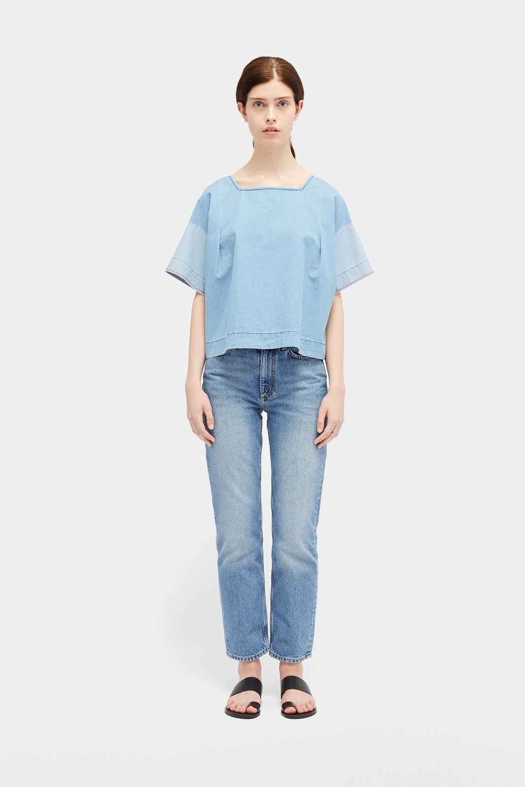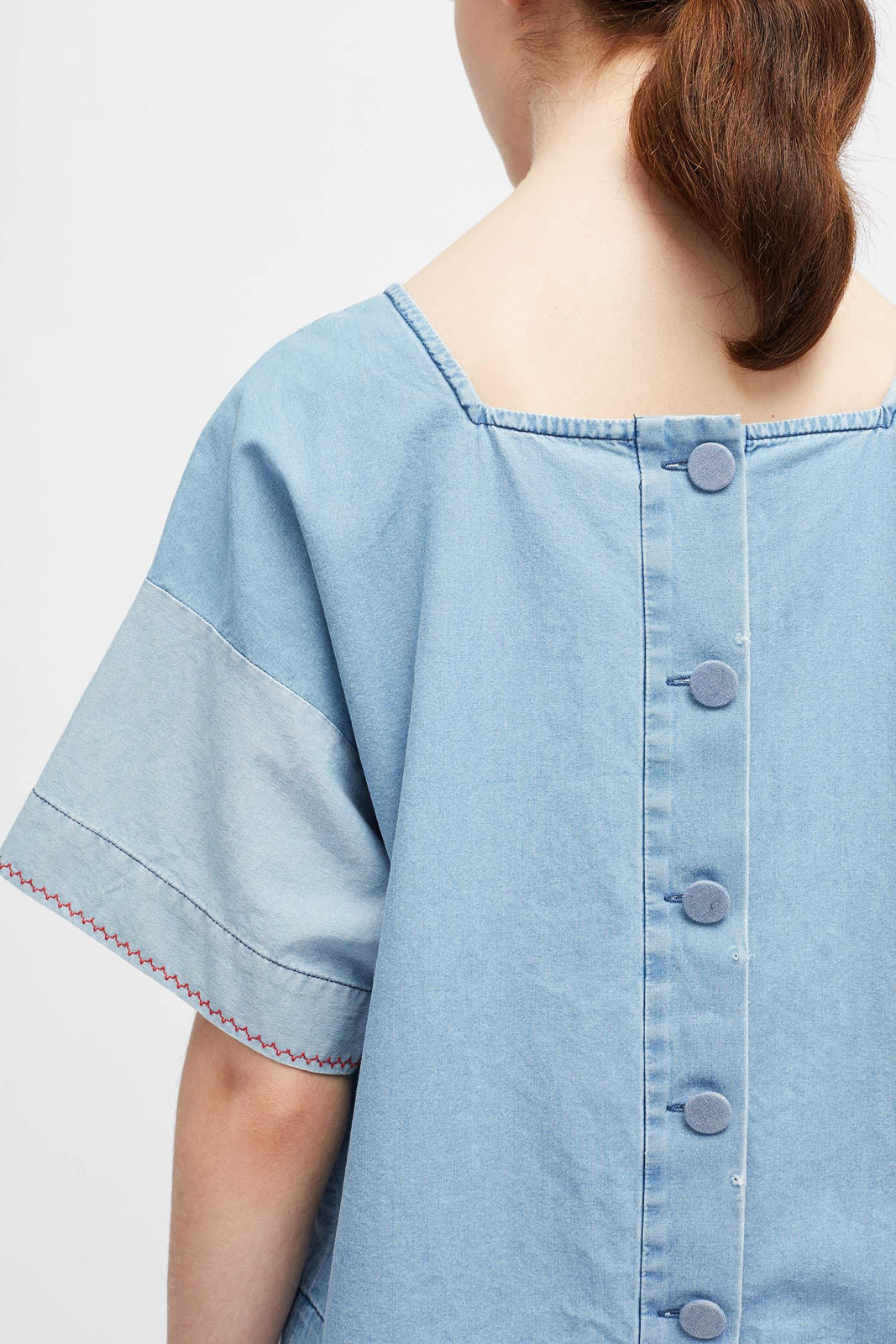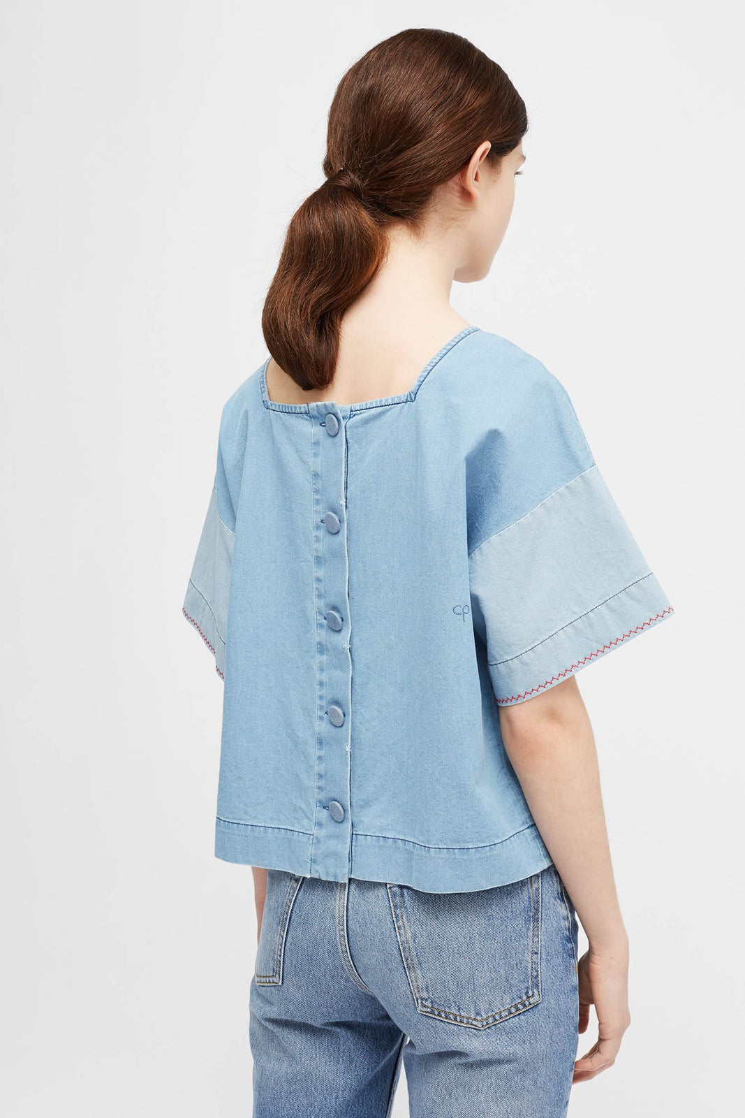 This indigo-dyed cotton top is cut for a loose, boxy fit with a wide-square neck - a nod to traditional Mexican styles. The short sleeves are contrasted with light-blue cuffs, while buttons run along the back to the straight-cut hem.