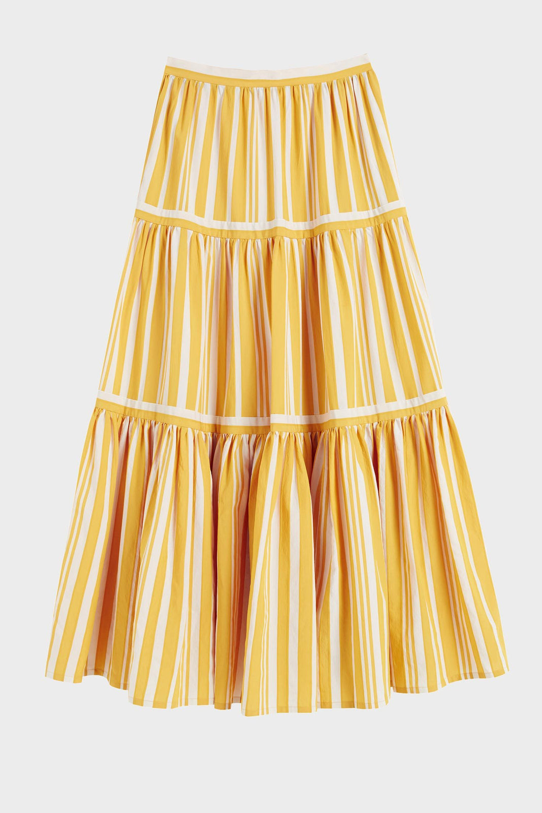 Interwoven with buttercup yellow and ivory stripes, reminiscent of a vintage seaside parasol, this floaty tiered maxi skirt is the perfect piece for the summer months. It is made from a lightweight viscose jacquard, with gently gathered panels falling to the floor. Team with the coordinating loose-fit shirt for a look that exudes bohemian elegance.