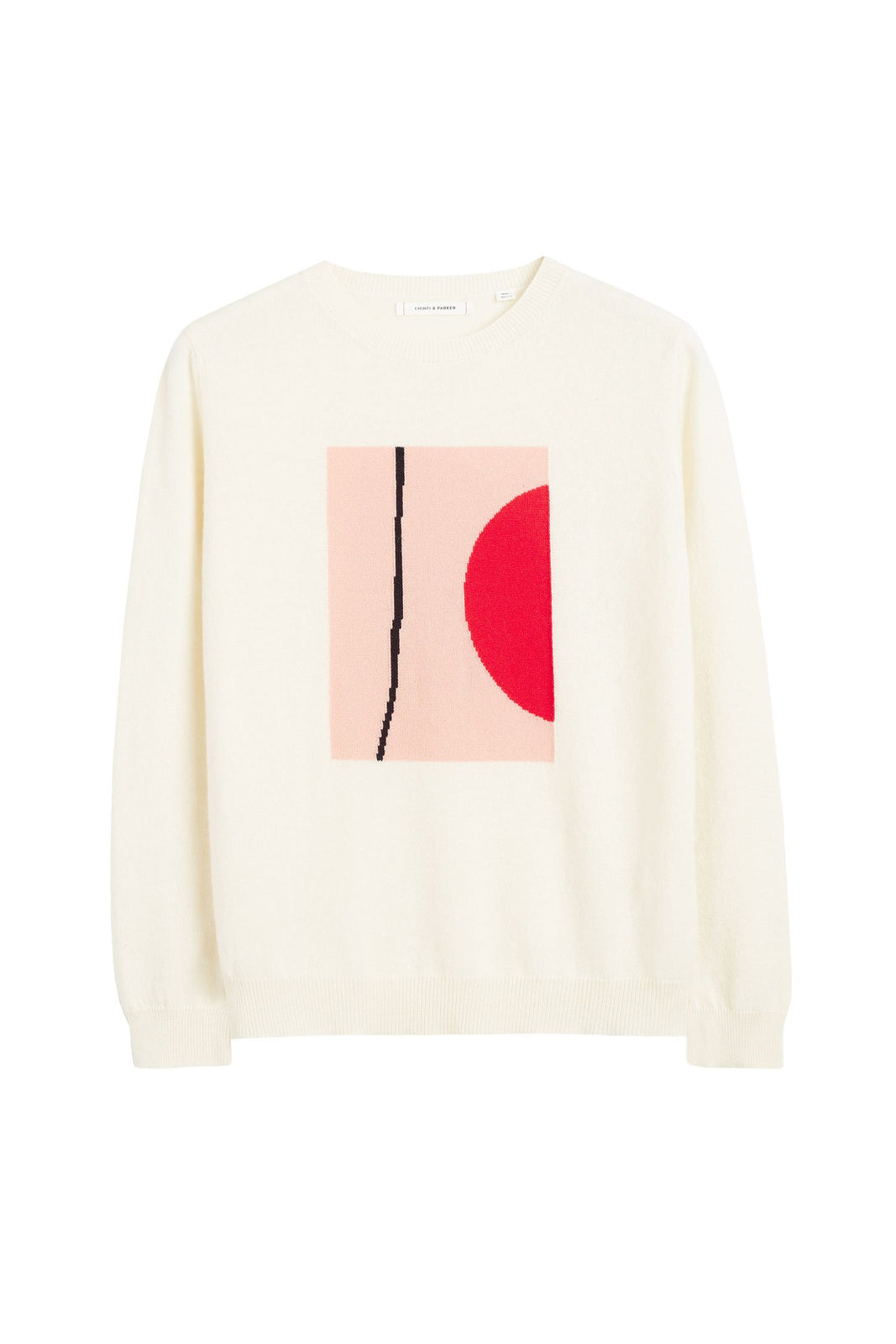 This mid-weight cream 100% cashmere sweater was created in collaboration with artist Caroline Popham. It's shaped for a classic fit and features true-intarsia shapes in cream, dust-blue and flame-red.