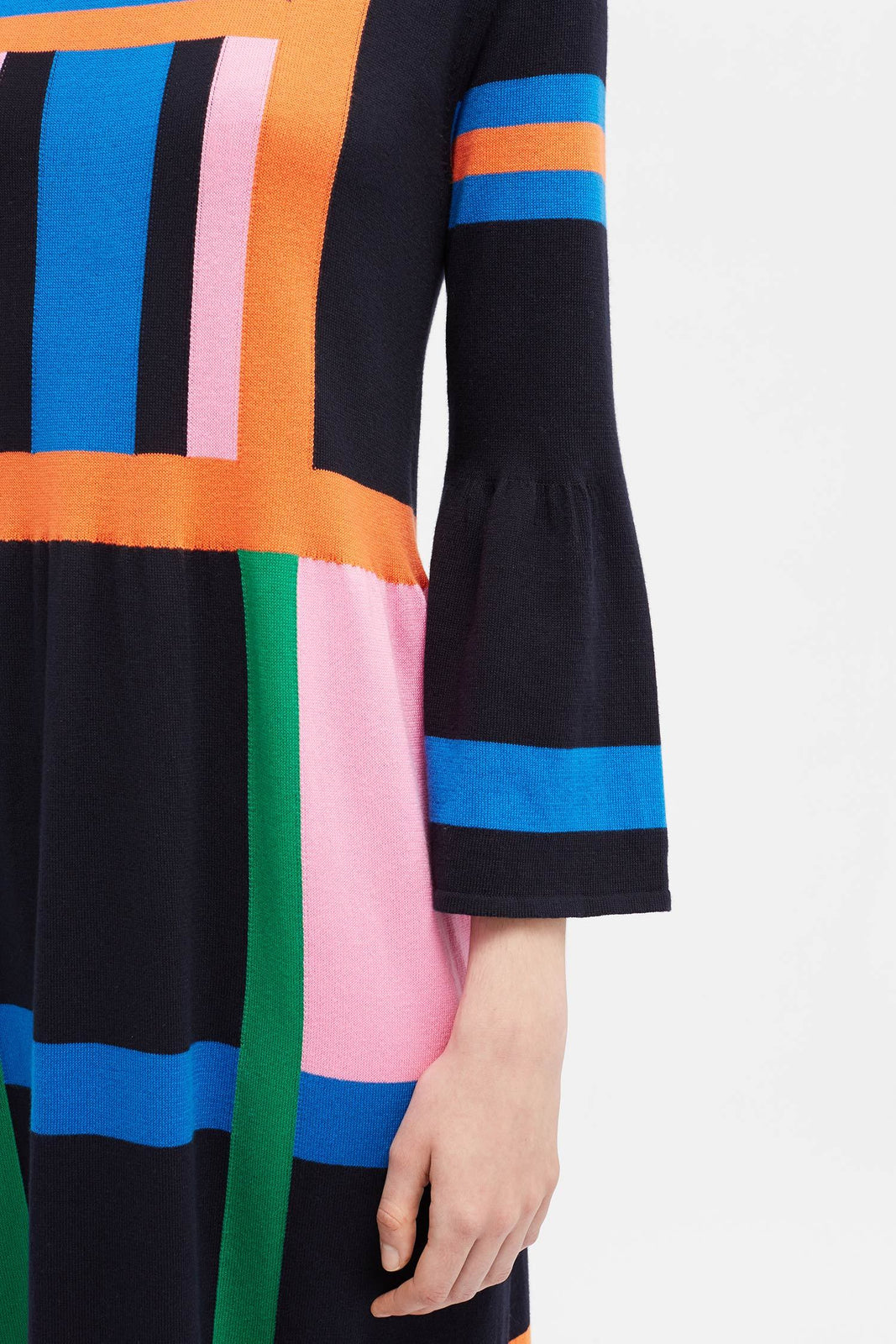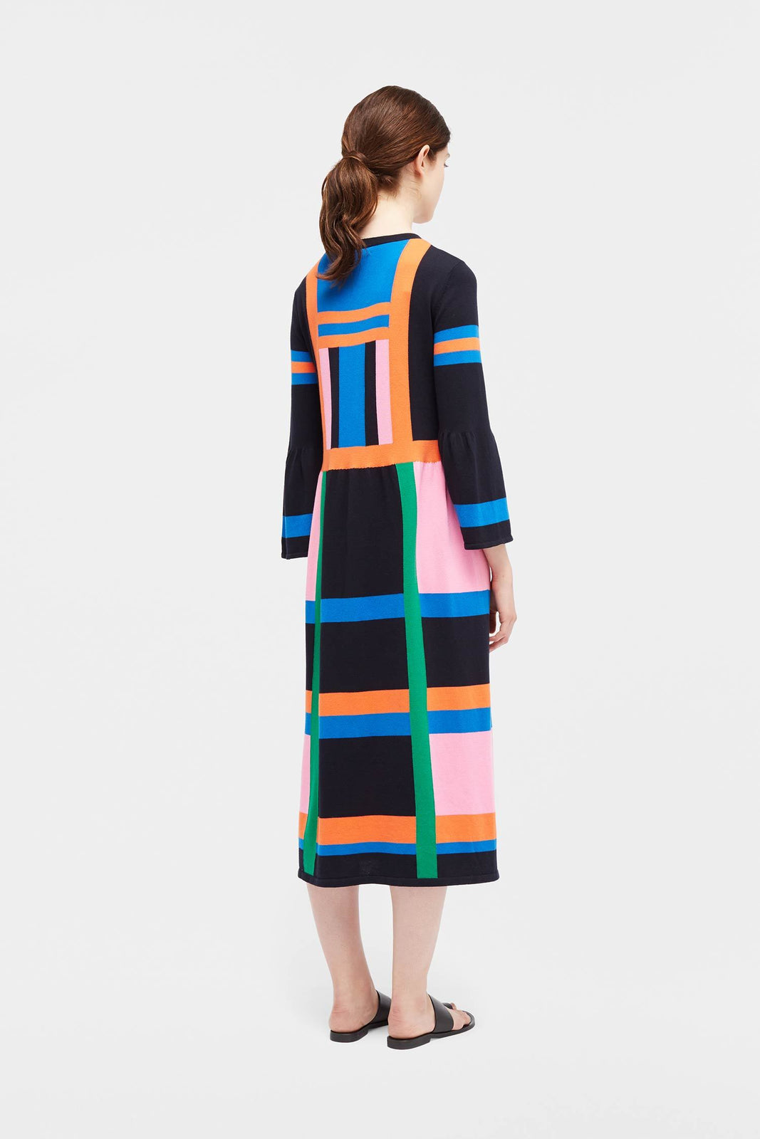 Inspired by the season's muse, Frida Kahlo, this navy 100% cotton dress is contrasted with multicoloured panels in vibrant hues. It's made in the UK with a crew neck, fluted cuffs, and a defined waist that flares into a midi skirt.