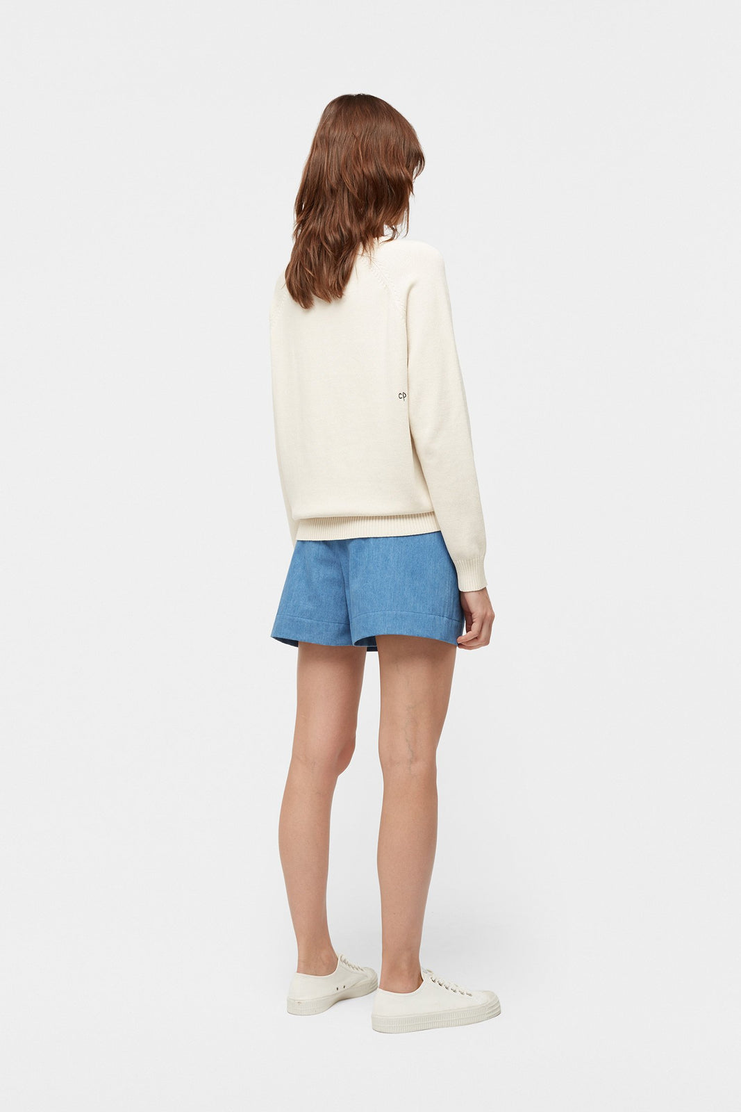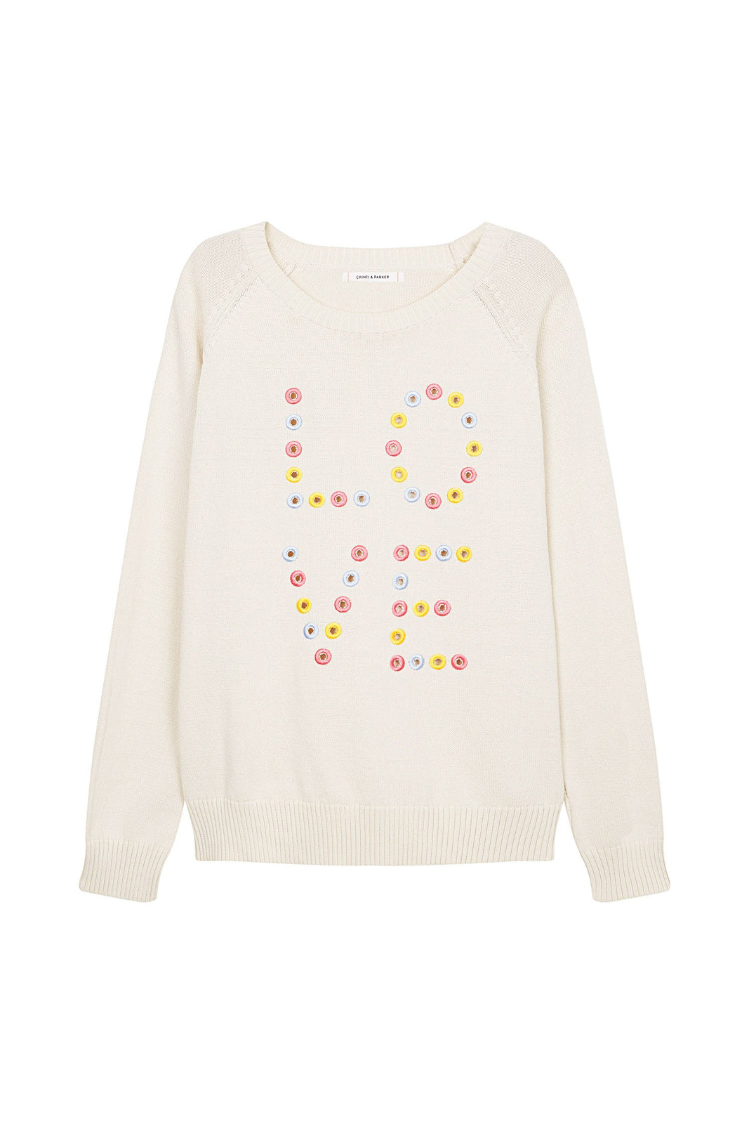 For SS18, the house's iconic Love Sweater is reinterpreted in eye-catching rainbow-hued cutout letter intarsia on 100% cream cotton.