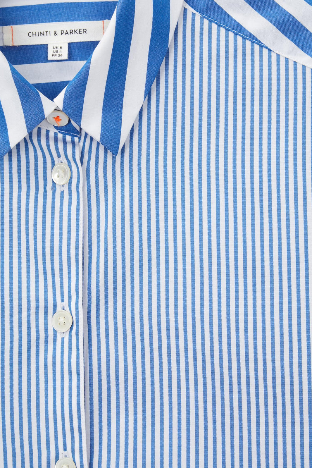 This navy and white striped cotton-poplin shirt is cut to our signature boyfriend silhouette with a point collar, buttoned cuffs and a curved hem. Contrasting wide-stripe accents and discreet orange embroidery bring a new-season edge.