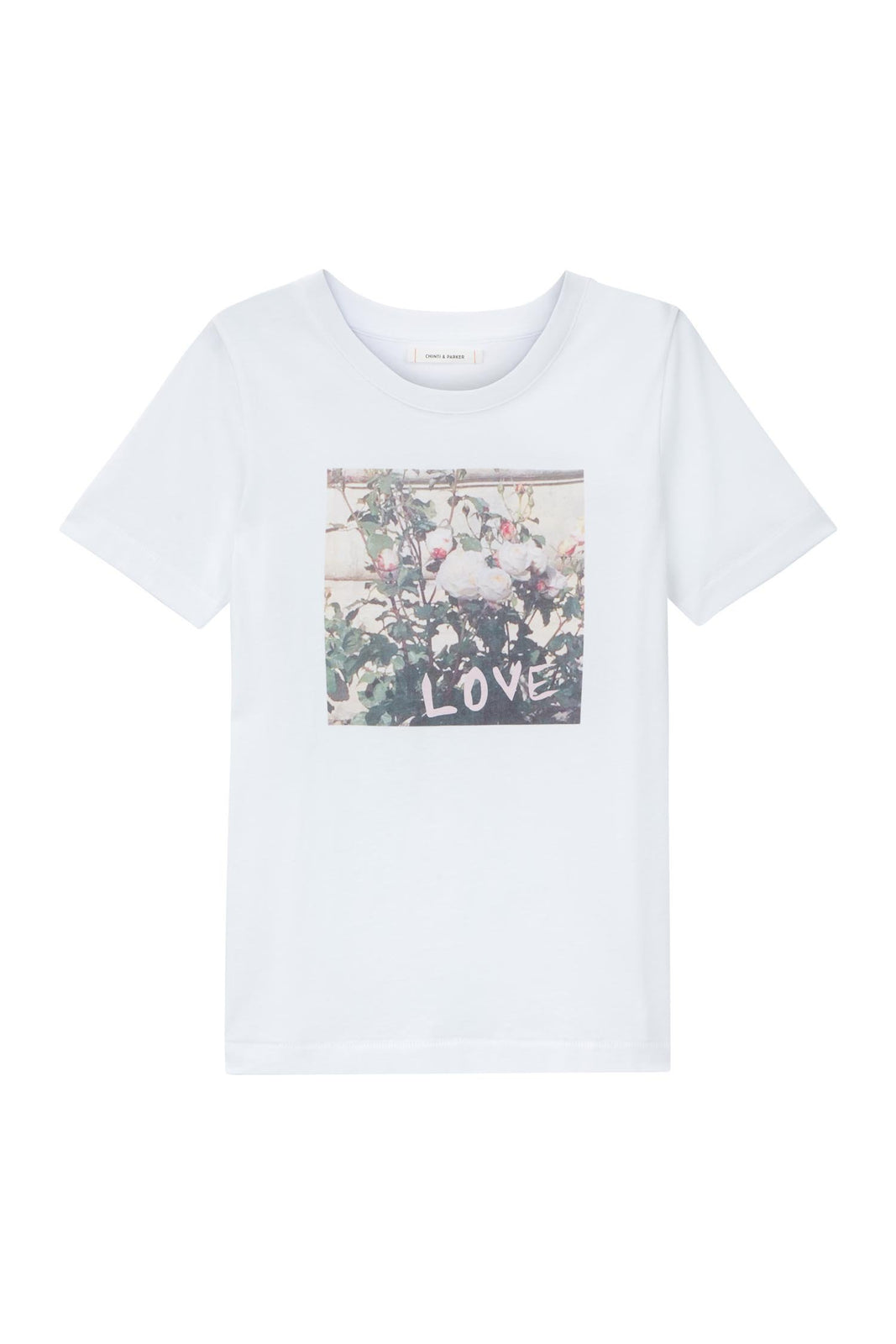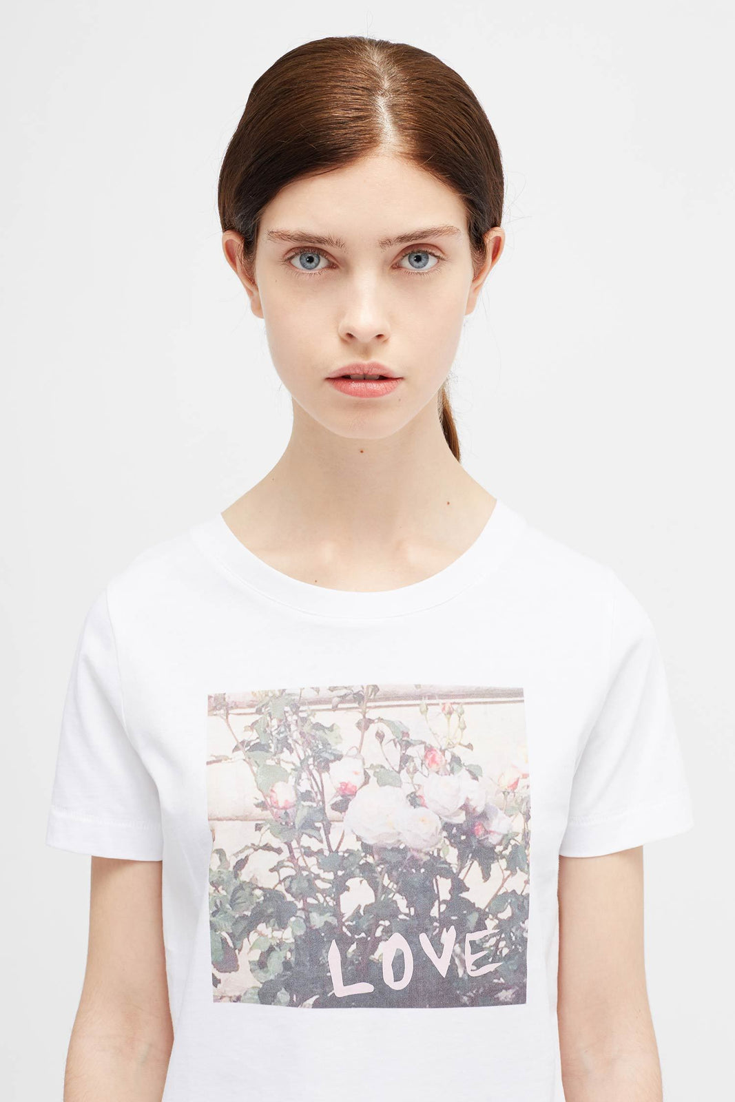 This white 100% cotton slim-fit T-shirt is cut for a classic fit with a round neck, short sleeves, and a curved hem. A faded digital floral print features at the front.