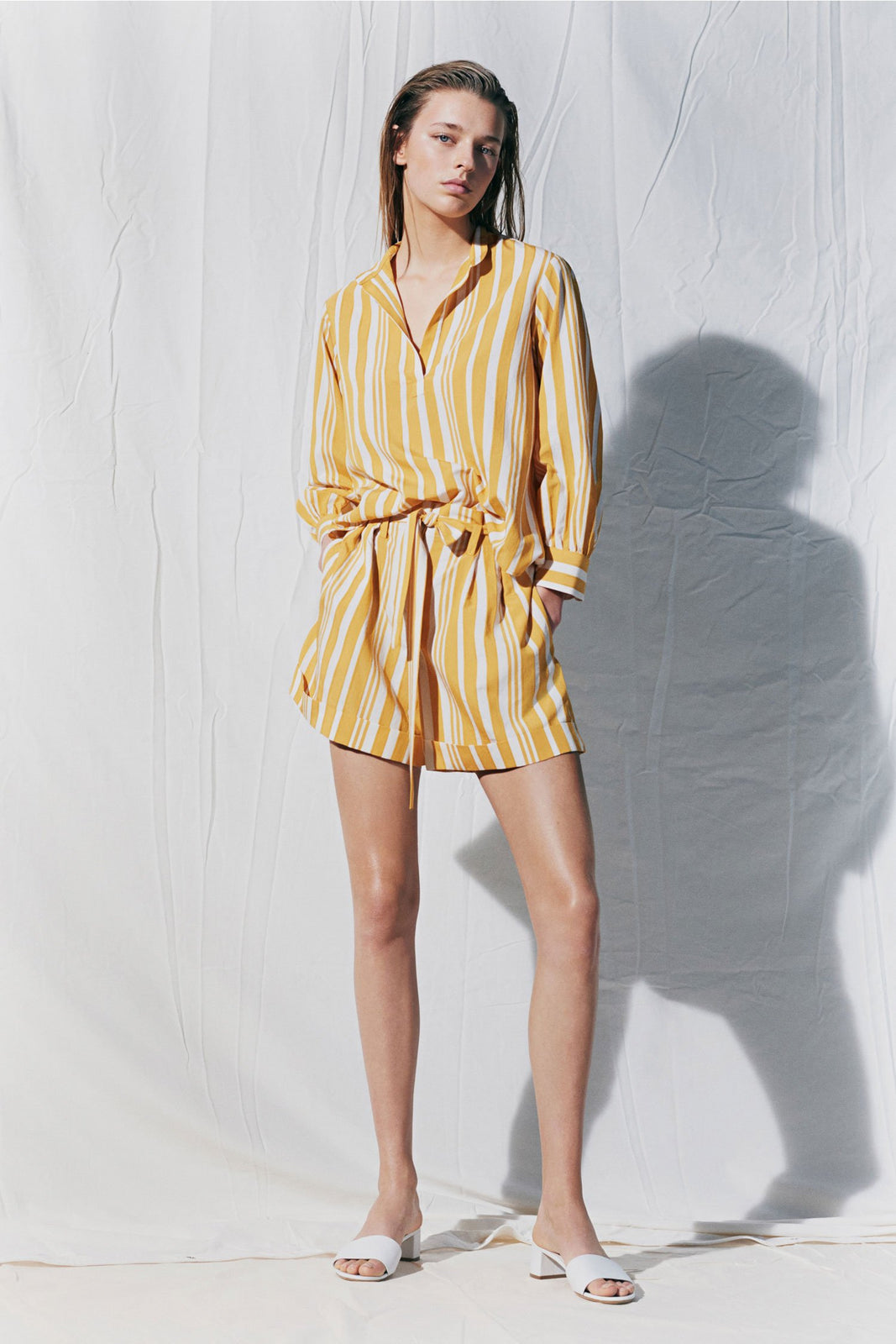 Interwoven with yellow and ivory stripes, reminiscent of vintage parasols, this floaty viscose-jacquard blouse is an elegant way to introduce summery colour into your wardrobe. It is shaped for a relaxed, easy fit with balloon sleeves, a stand collar and a half placket. Wear it with the coordinating skirt for a chic and vibrant day-to-night ensemble.