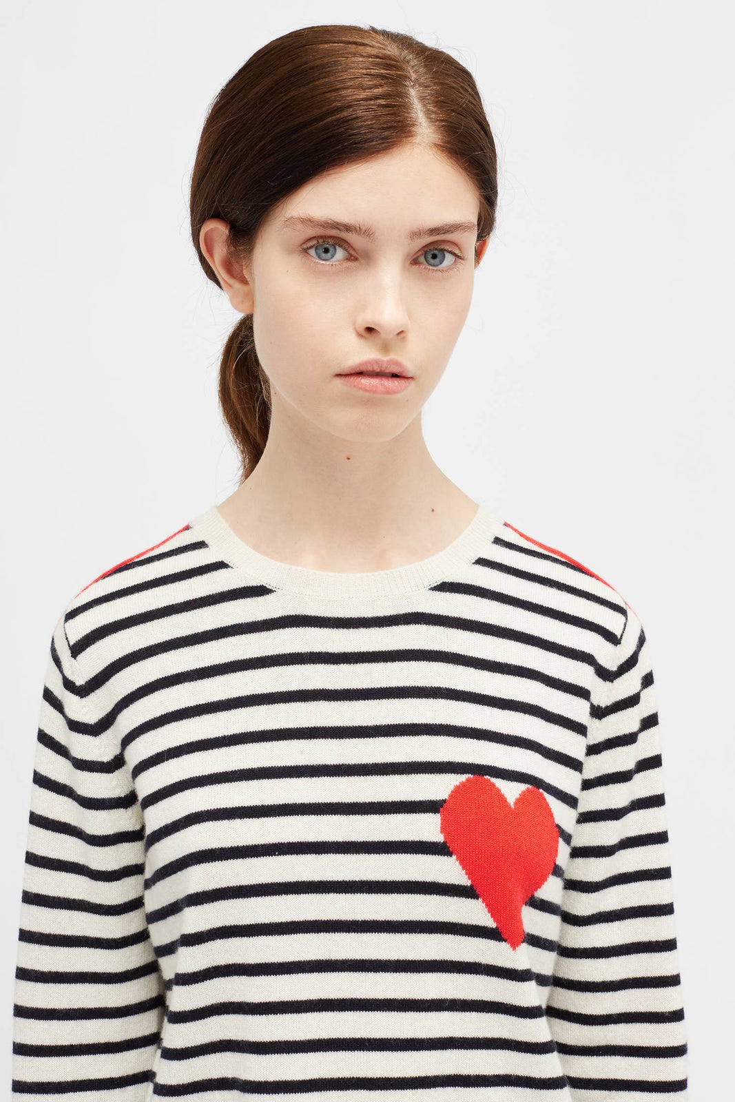 A new take on our navy and white 100% cashmere Heart Breton sweater. This classic-fit style is shaped with a crew neck, and updated with red true-intarsia sleeve stripes to match the hallmark heart.