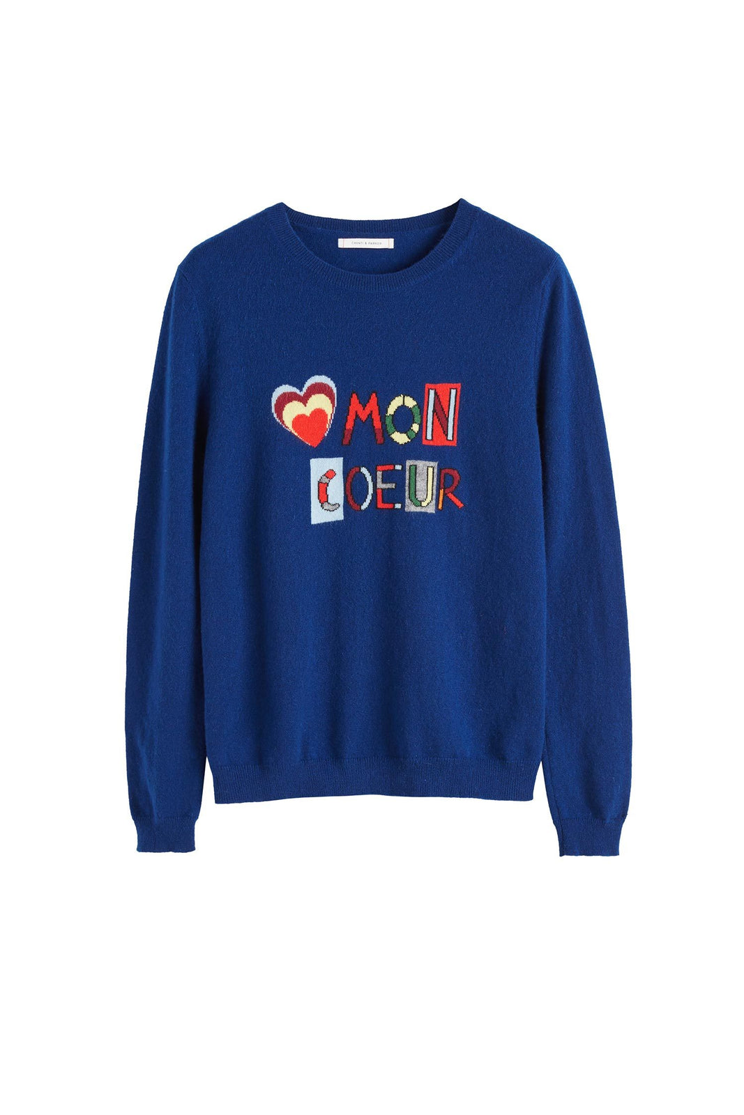 Our regular-fit pure cashmere sweater receives a new-season rework. This petrol-blue style is shaped with a crew neckline and ribbed trims, and features a true-intarsia Mon Coeur slogan at the front.