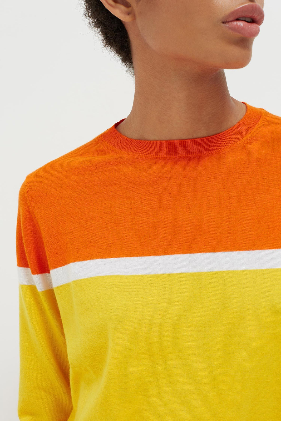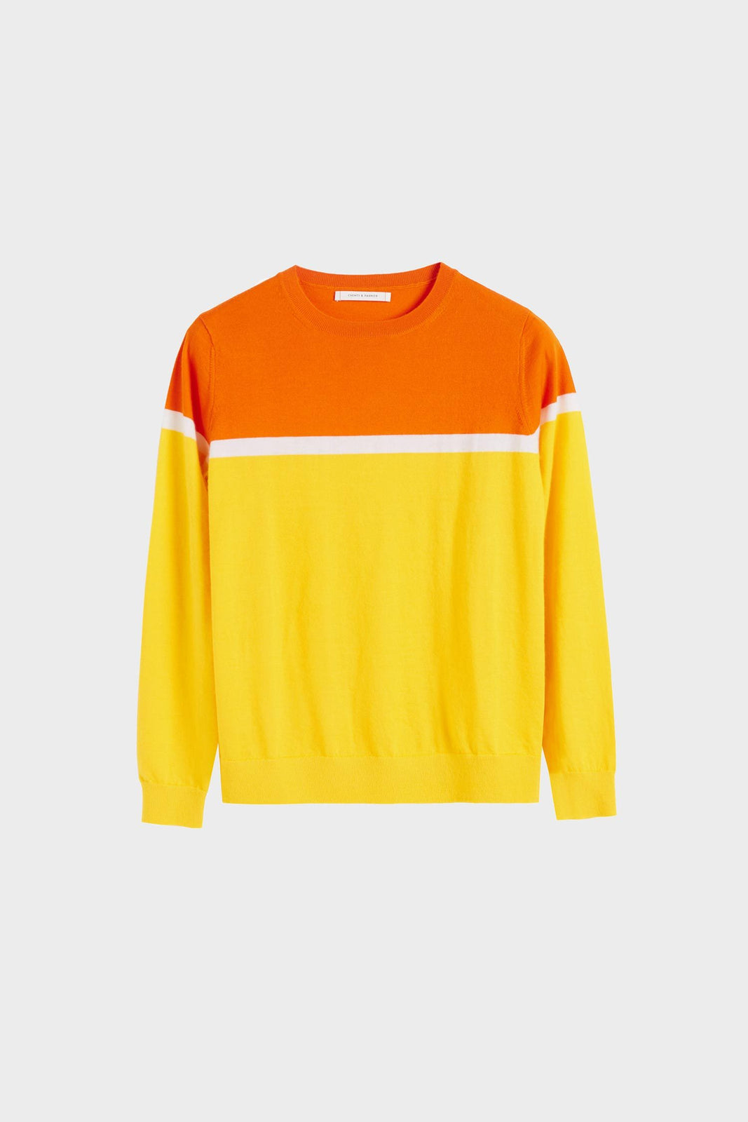 A modern, easy-to-wear take on colour blocking, this classic-fit sweater combines vivid shades of buttercup yellow and bright orange. A thin line of cream separates the two, heightening the striking appeal of the piece. It is crafted from our 16-gauge cashmere, which is our lightest yet, ideal for layering all year round. Team with coordinating track pants for a luxe weekend look.