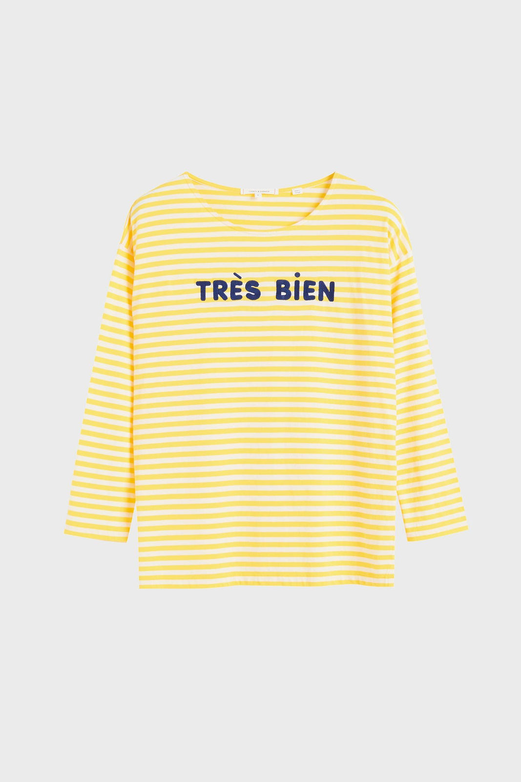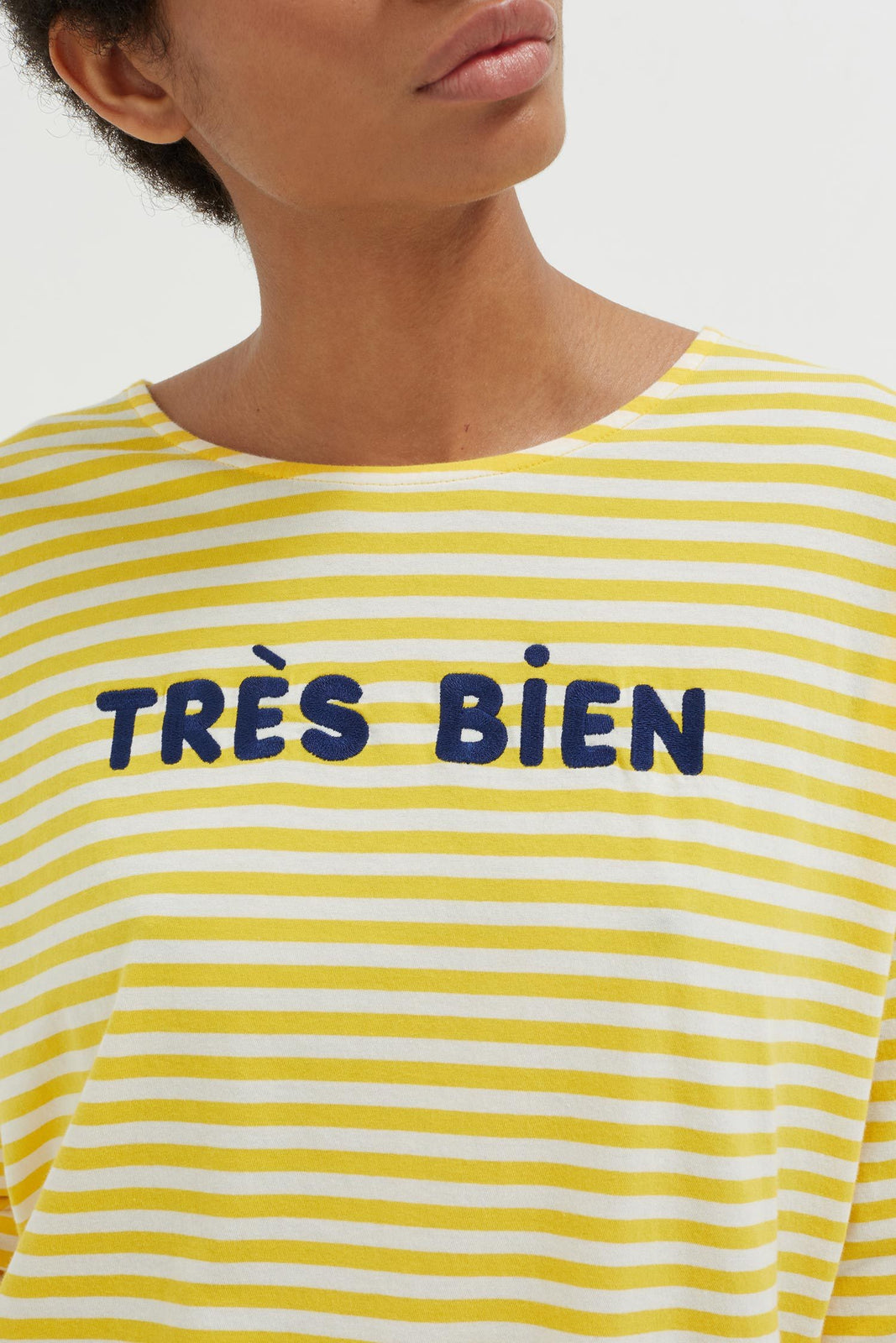 A playful new interpretation of the iconic Breton top, this white and yellow striped 3/4 sleeve T-shirt features one of the new slogans for Pre-Fall 2019, spelling out the French phrase Très Bien in navy satin-stitch embroidery. Made from yarn-dyed pure cotton, it is shaped for a comfortable, relaxed fit with a flattering round neckline.