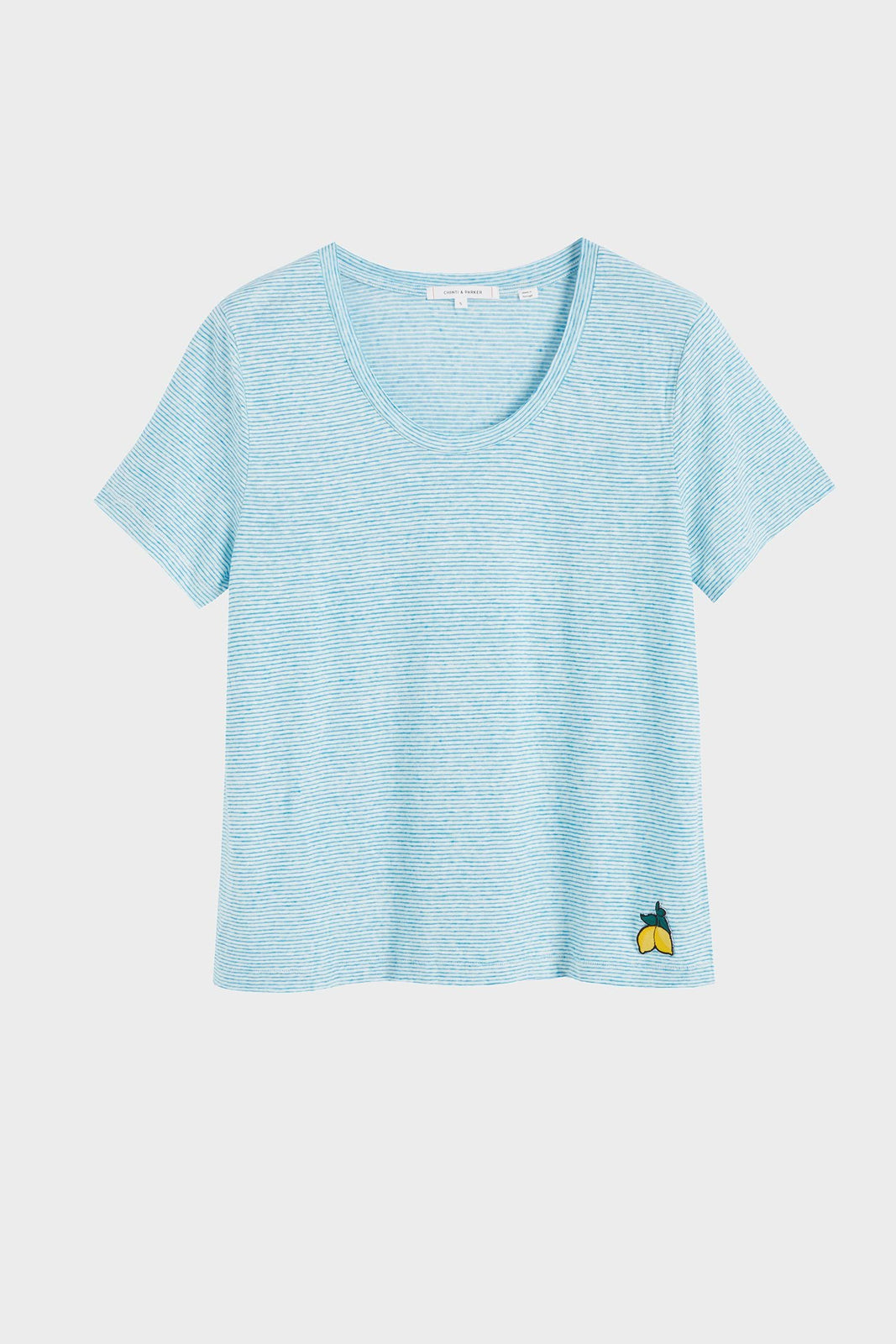 Update your tee collection with this blue and white striped T-shirt. A new shape for the season, it is made from pure linen and features a flattering scoop neckline. The finishing touch is the lemon embroidered badge near the hem, which heightens the summery feel of the piece.