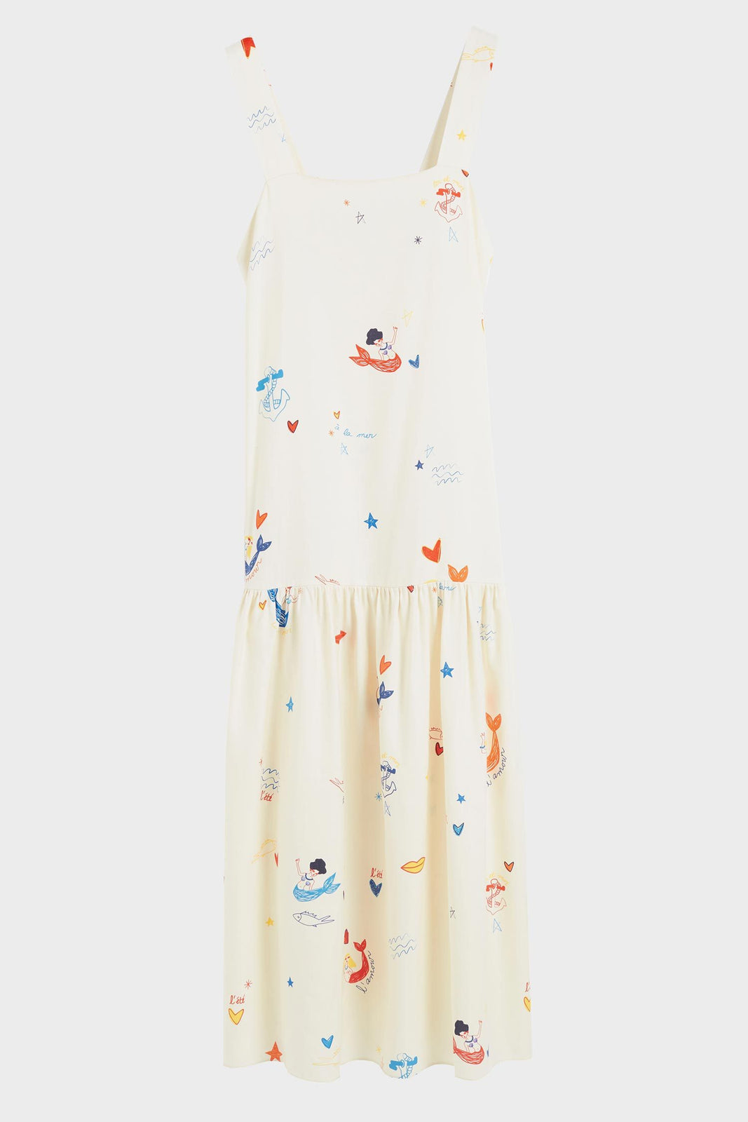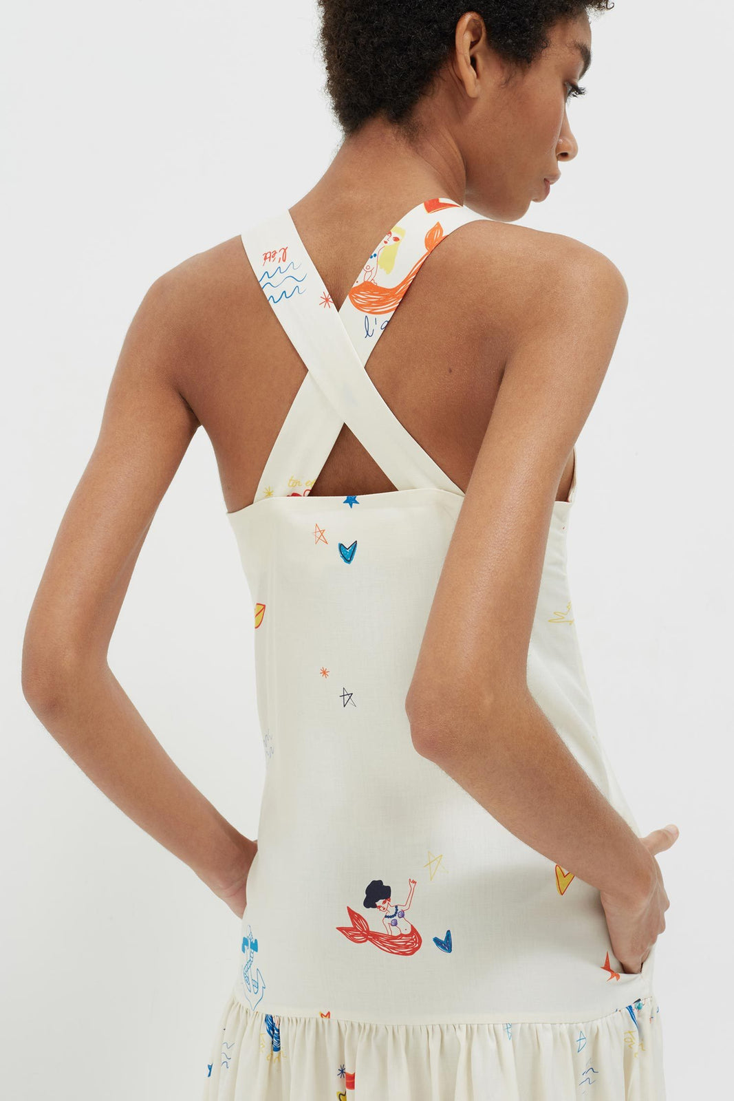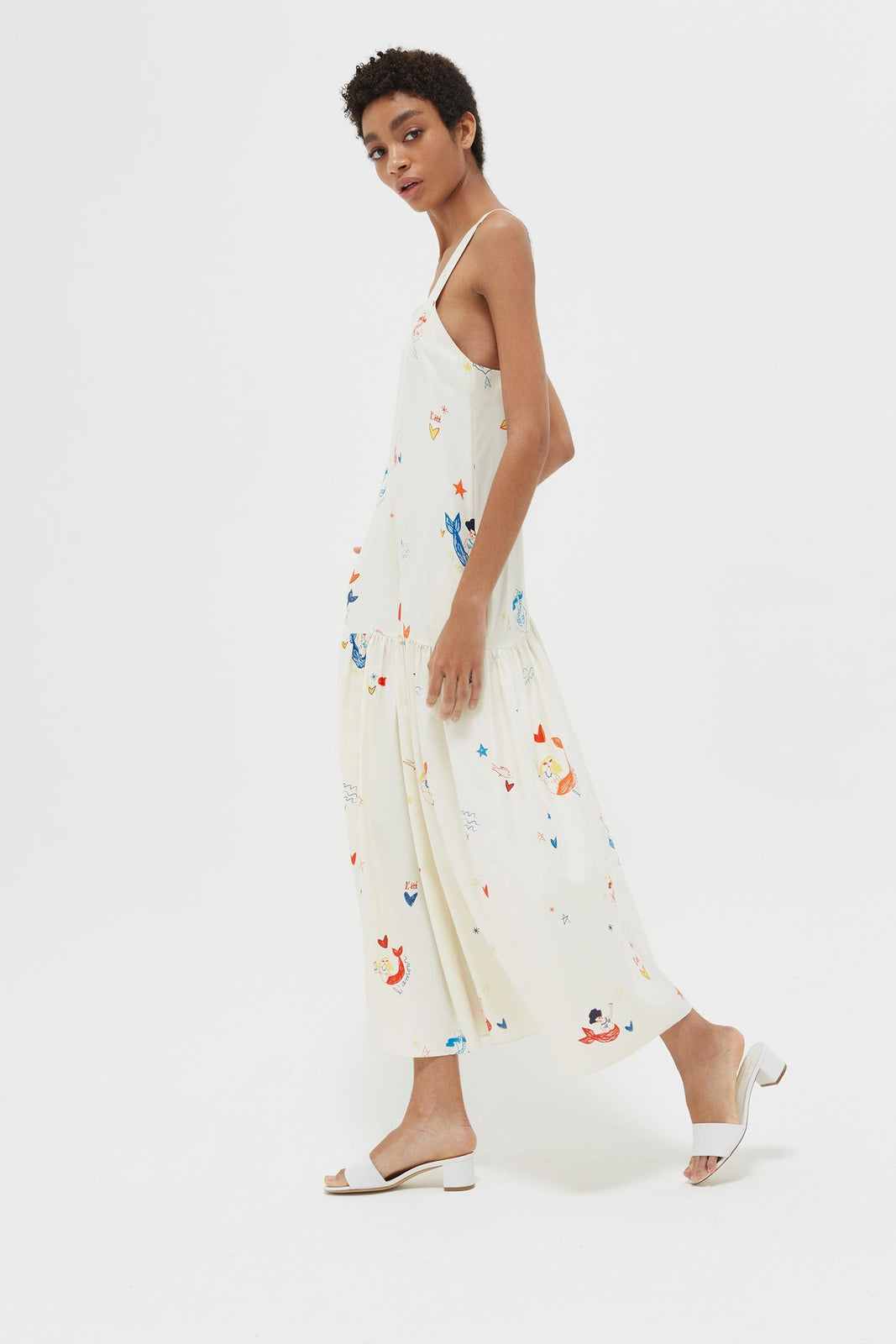 A whimsical take on the nautical theme, this beautiful mermaid pattern features the mythical figures sitting alongside hearts, french script, stars, waves and anchors. Here, it features on an elegant cream silk sundress, which is easy to dress up or down for all manner of occasions. It is shaped for a floaty fit, falling softly from the square neckline to a gently gathered drop-waist.
